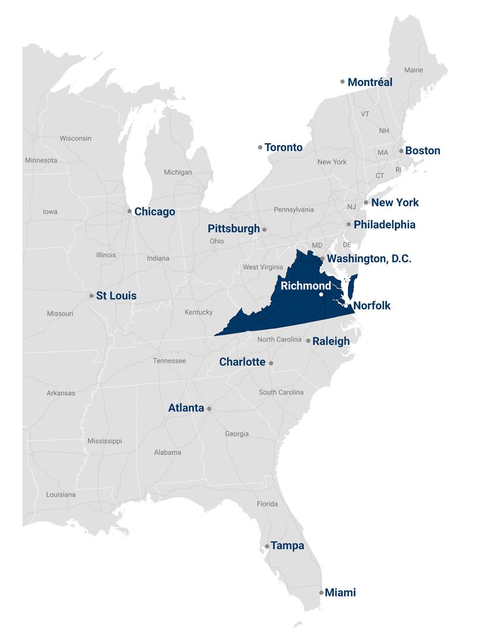 Centered within the U.S. East Coast, Virginia is within a one-day drive of 47% of the U.S. population.