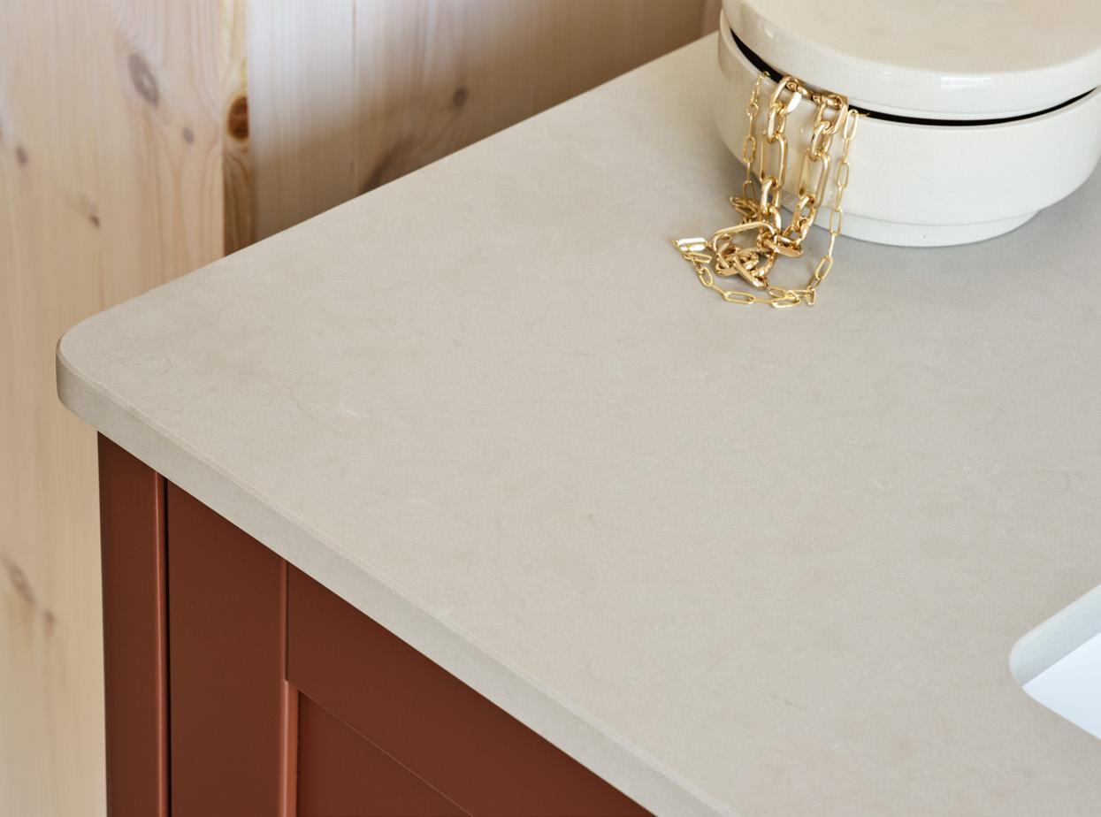 Komposittstein: Er et industrielt produsert steinmateriale (kvartskompositt). Hovedingrediensen er kvarts, som vibreres sammen med bindemiddel og fargestoffer i vakuum. Komposittsteinens egenskaper og utseende kan variere fra fabrikat til fabrikat, og det kan se ut til at naturstein er bestandig mot flekker og riper. Selv om komposittsteinen tåler varme, bør den ikke utsettes for varmesjokk. Komposittsteinen er slitesterk, holdbar og ikke porøs. Du trenger aldri å impregnere den, og i tillegg er den enkel å rengjøre og vedlikeholde. Til daglig rengjøring av topplaten i kvartskompositt anbefaler vi vann og et mildt rengjøringsmiddel. Bruk en bomullsklut eller oppvaskklut med litt oppvaskmiddel, og så er det bare å tørke av. Hvis du deretter tørker tørt med en mikroklut, slipper du render etter oppvaskkluten.