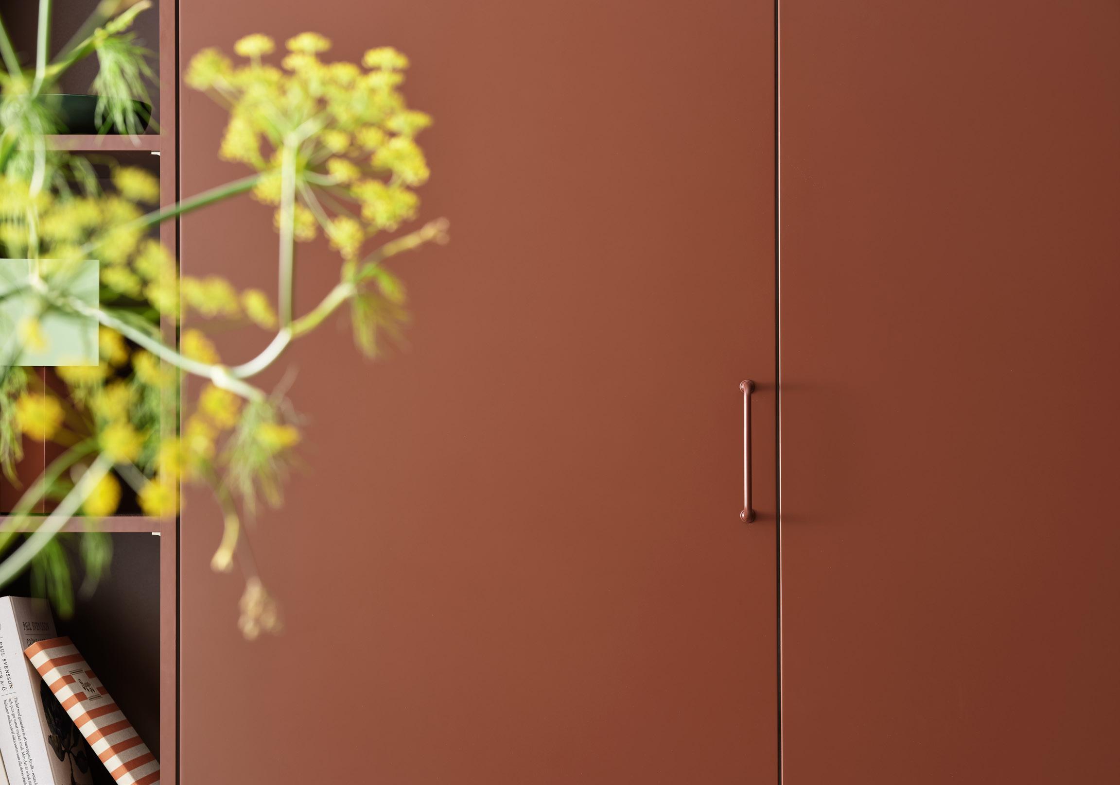 Andra nyheter är den öppna förvaringshyllan Vilda som syns på köksön i det nya jordröda köket och vackra bänkskåp med vitrin i härdat glas som går ända ner till sockeln. Vi kommer också med en lucka i en lite ljusare och elegant brun ek som gör möjligheterna med vårt sortiment ännu större.