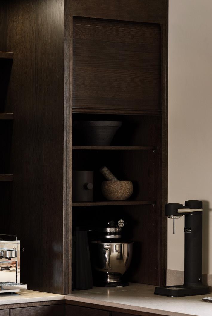 Ett sobert kök med luckan Liv i det nya utförandet brun ek som skapar en exklusiv känsla. De nya vitrinskåpen med glas ända ner till golvet kan du fylla med dina favoritsaker för att ge köket en personlig karaktär och detaljer i svart och natur förstärker det jordiga, mustiga uttrycket. En praktisk funktionsvägg med jalusi gör att du kan välja synligt och lättillgängligt eller undangömt och prydligt – och bredvid har vi gjort ett skräddarsytt utrymme för din kaffemaskin och finaste koppar.