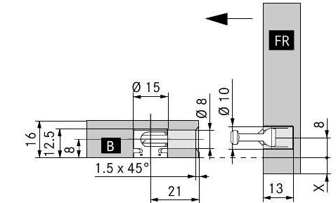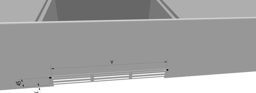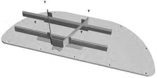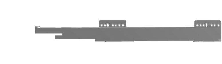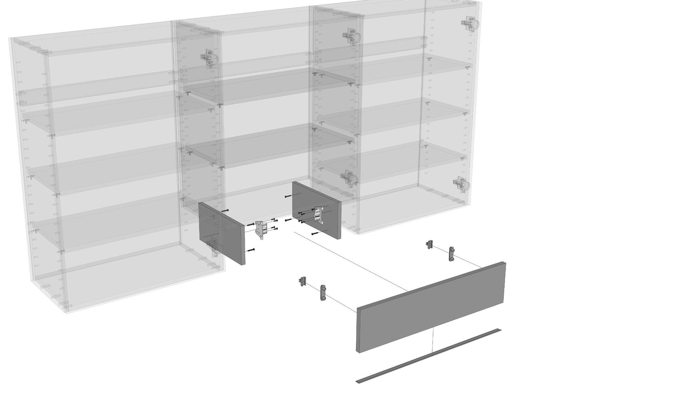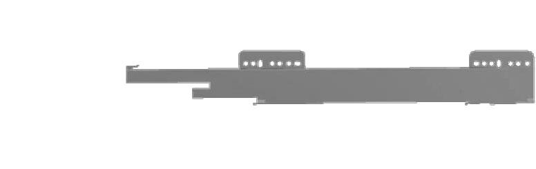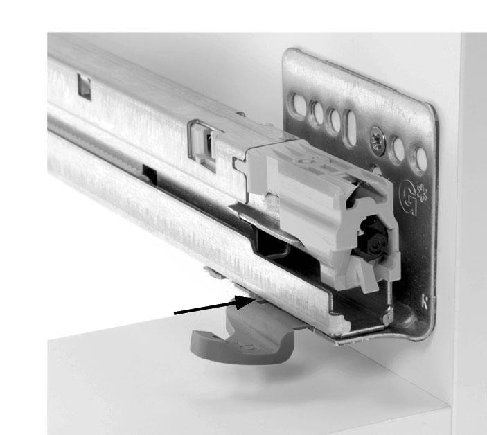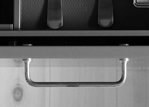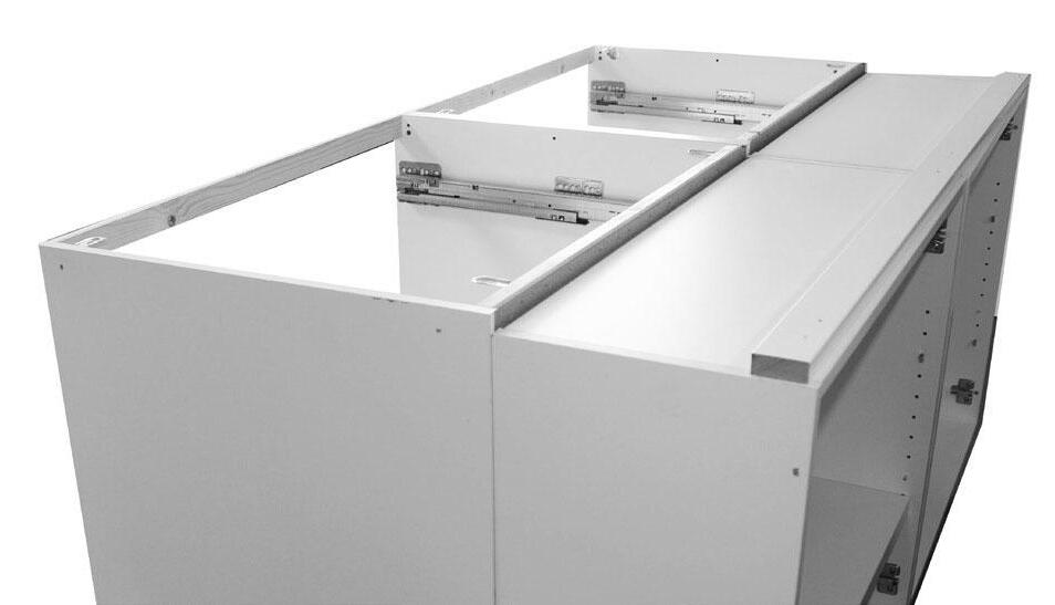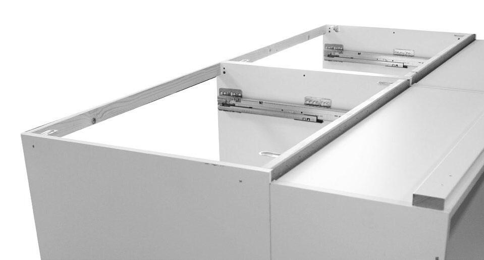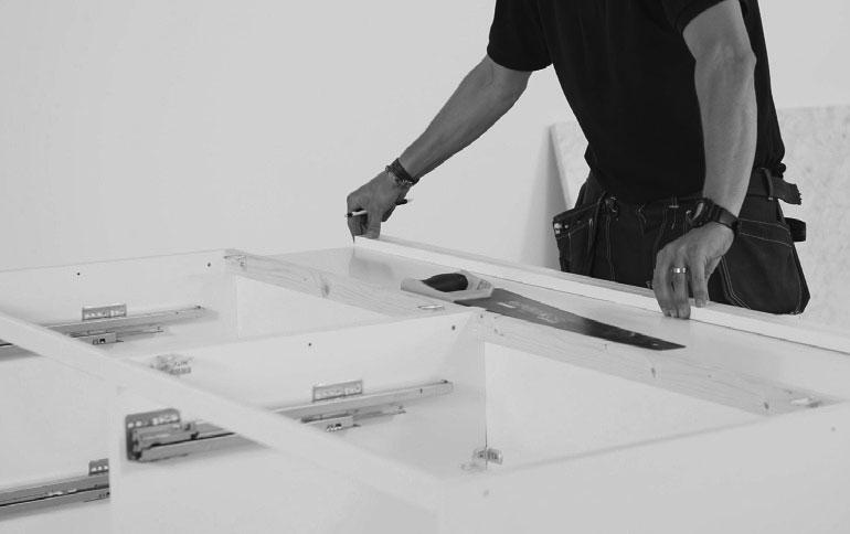 Facklisterna i 300, 400, 500 och 600 mm breda skåpen är förberedda för skärbräda. Såga med sticksåg enligt den tjocka linjen på den gråmarkerade ytan på bilden. Dra ut de kvarvarande bitarna med en tång. Fäst glidskenorna och rensa bort eventuella limrester så skärbrädan löper fritt.