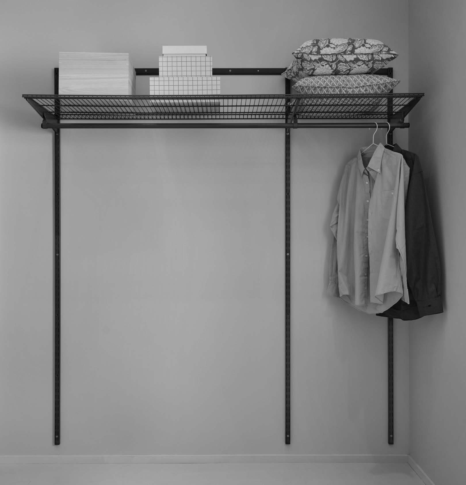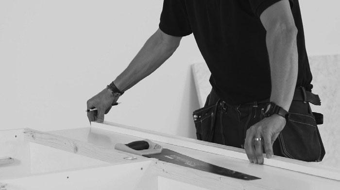 1. Vid behov, kapa bärlist, klädstång, hängskena och trådhylla till önskad längd.