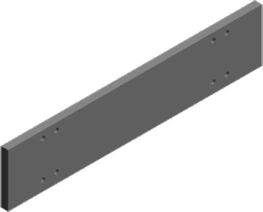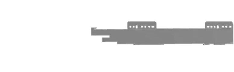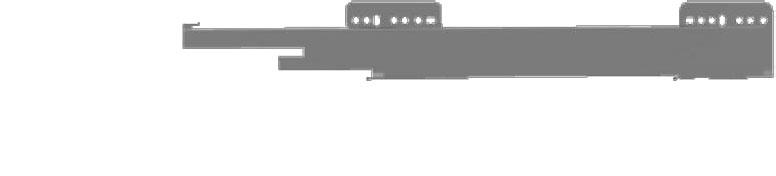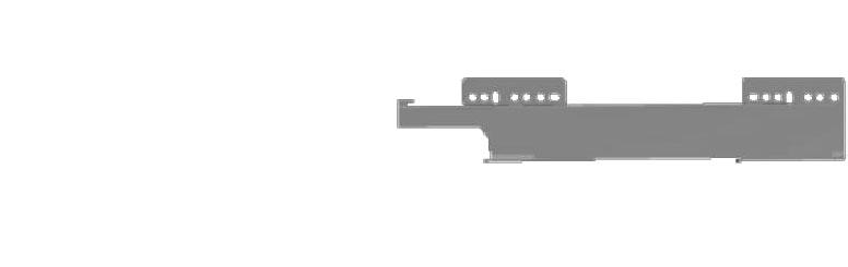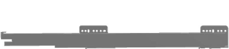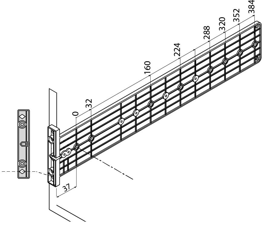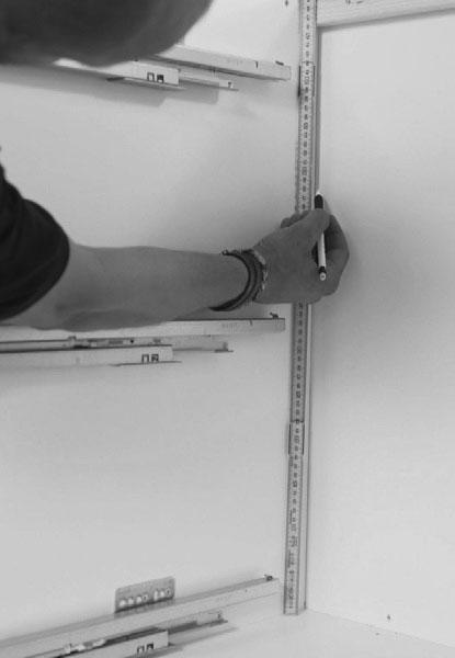 1. Börja med skenan på stomsidan. Hålraden börjar 52 mm in från framkant skåpstomme. Därefter borras åtta hål med diameter 5 mm med början centrum 29 mm från skåpsbotten. Sedan kommer de övriga på 93, 157, 221, 285, 349, 413 och 477 mm. Montera skenan med åtta systemskruv 6,1x13 mm.