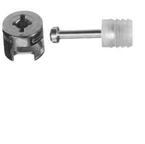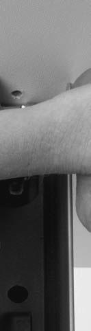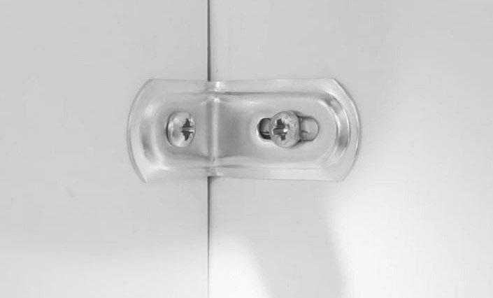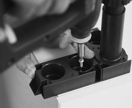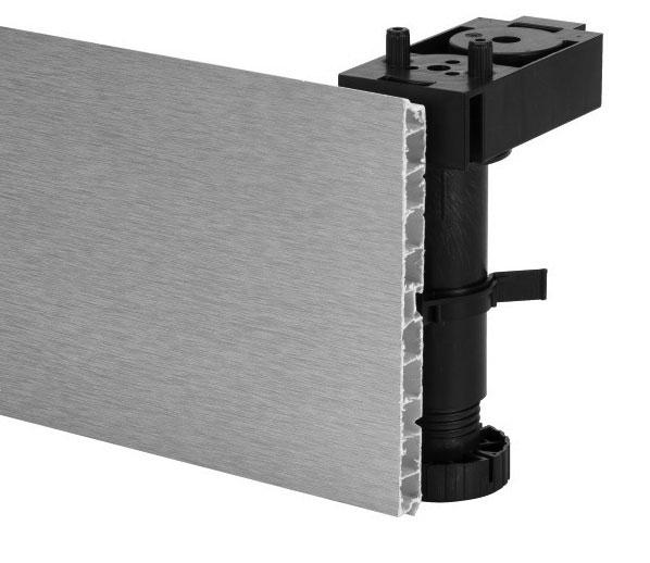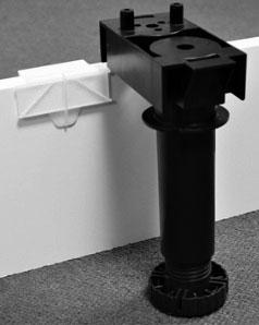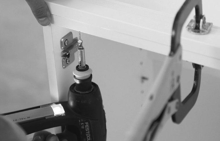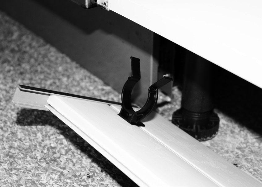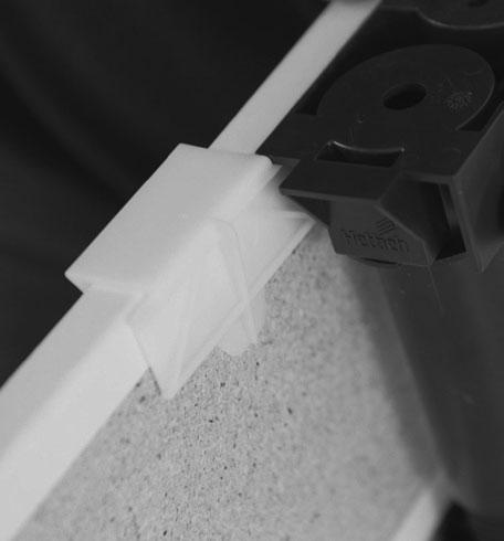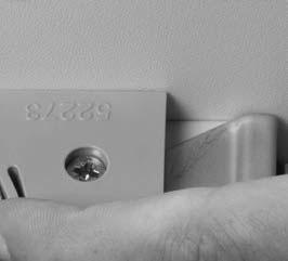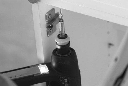4. Efter att skruvat fast den vita hylsan på stolpen träs plåtvinkeln Curry art.nr. 30190 med L-profil över hylsan och monteras med tre skruvar art.nr. 39111 TFX 3,5x25 mm i skåpets facklist. Förborra med ett 2 mm borr. Mät från insida kort facklist. Notera! Det är medskickat ett fäste för att monteras i ovankant upp mot bänkskivan. Det används inte i Vedums montering. Använd L-profilen istället.
