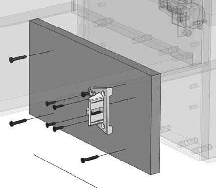 4. Montera vinkeljärnet med hålet uppåt i de förborrade hålen i skärmen med fyra systemskruv 6,1x13 mm. Vid skåpsbredd 1000 mm används hålen 52 och 84 mm från skärmens framkant på höjderna 468 respektive 500 mm från skåpsbotten. Vid skåpsbredd 1200 mm används hålen 28 och 60 mm från skärmens framkant på höjderna 468 respektive 500 mm från skåpsbotten.