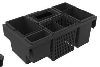 4. Montera hinkarna i ramen. Sarek smal art.nr. 30881 har plats för en hink som är 13 liter och ett mindre kärl på 2,8 liter. Sarek bred art.nr. 30882 har plats för två hinkar som är 13 liter.