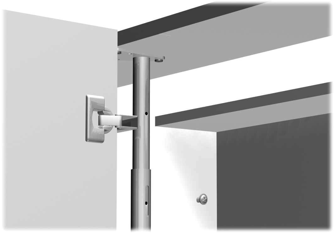 3. Montera detaljer på stolpen så att allt är nederst på stolpen. Avvakta med sprintarna. Vinkla in stolpen i skåpet och sätt stolpen på stolpfästet. Tryck upp detaljerna så att den nedre sprinten går att montera i hålet på stolpen.