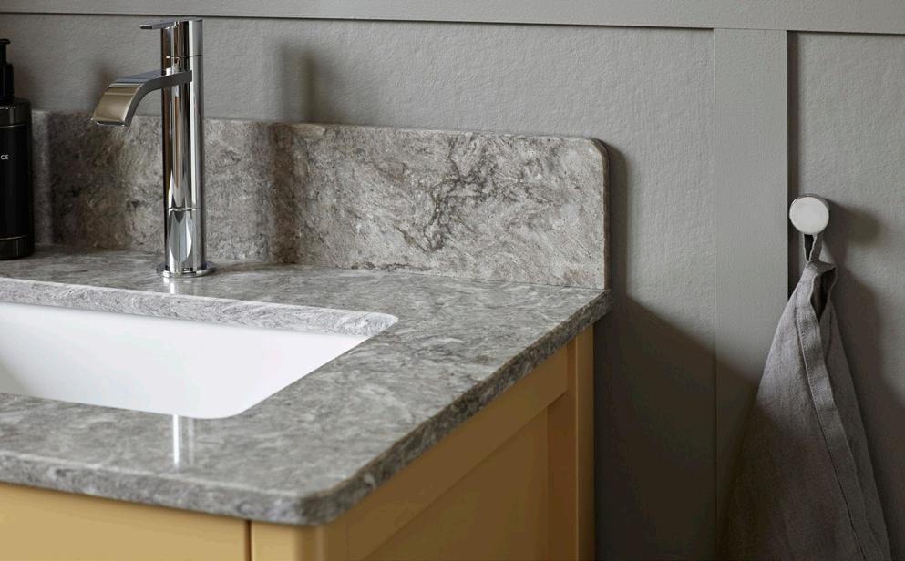 Flow vit/kulör: Målad 19 mm MDF-board (16 mm på underskåp 500 mm) med fasad greppkant och svagt rundad kant.
