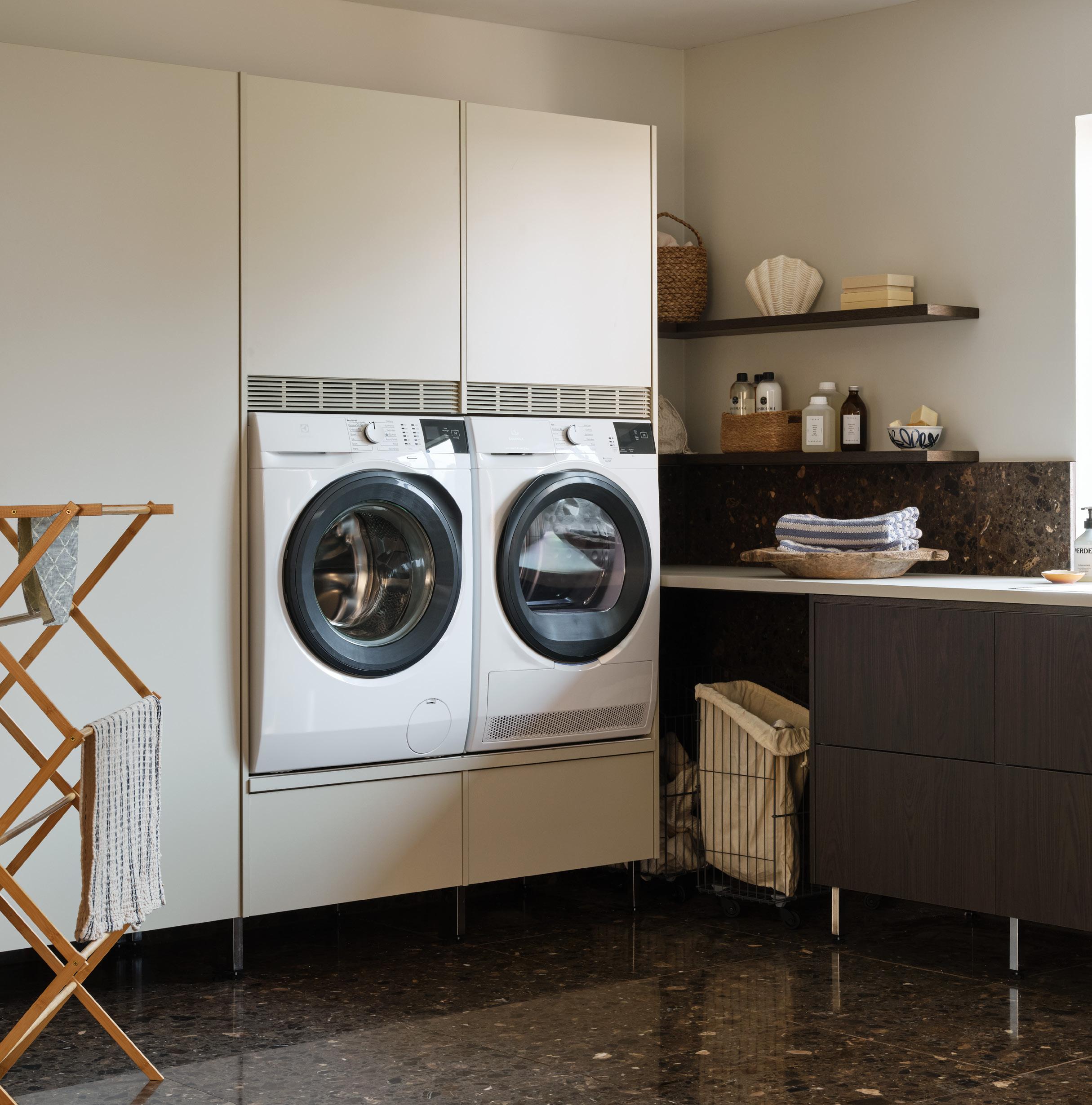 En tvättstuga i naturnära toner, varm träkänsla och materialblandning som skapar dynamik. Tvättstugan har massor av smarta lösningar som gör vardagen enklare, till exempel tvättmaskinens bekväma placering som ger en ergonomiskt bra arbetsställning, avställningsyta ovanpå maskinen och förvaringsväggen där det finns gott om utrymme för dina saker.