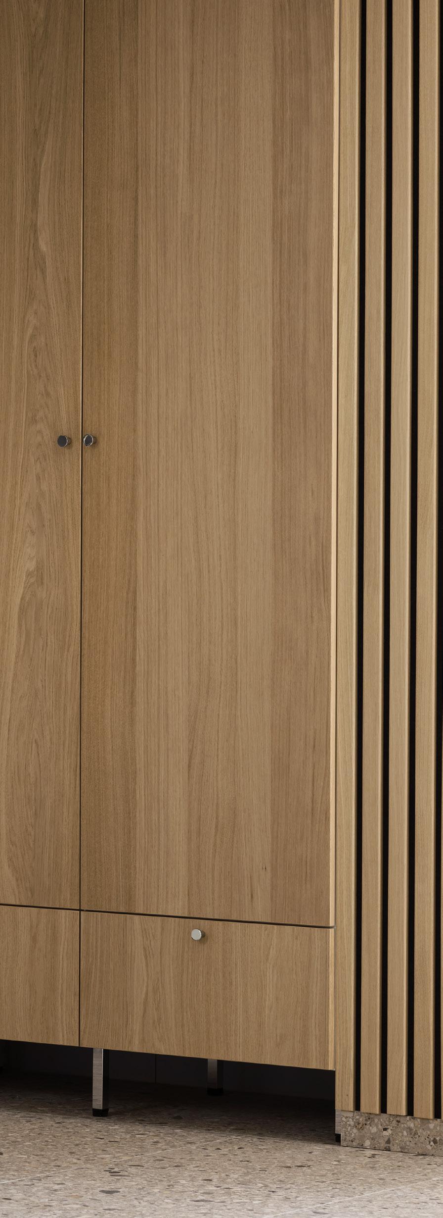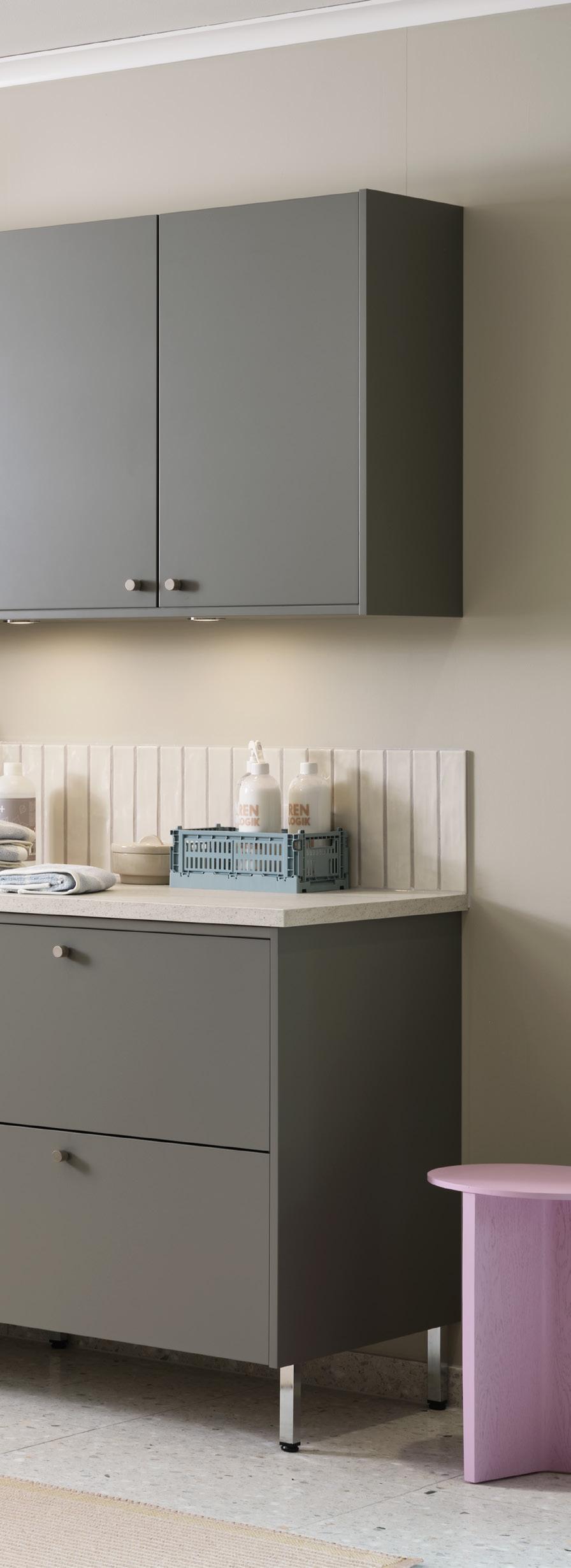 Den nya Svanenmärkta melaminluckan Ilse beige och Ilse brun ek gör tvättstugan till en lugn oas. Garderobsvägg, upphöjda vitvaror och bra arbetsytor på bänkskiva gör vardagen enklare. Hyllplan med plats för småsaker och lättillgängliga tvättkorgar i det öppna hörnet förstärker känslan av bekvämlighet. Ett fint terrazzogolv och stänkpanel knyter ihop helheten.
