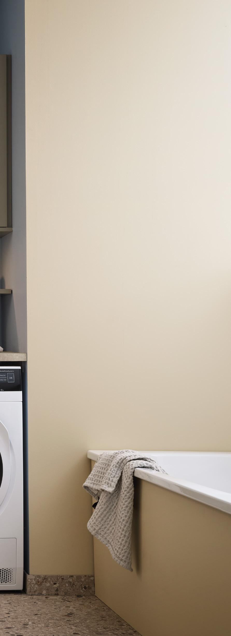 Här har vi gjort en vacker och välkomnande kombination där både badrum och tvättstuga får plats. En perfekt lösning för barnfamiljen. Tvättstugan har praktisk arbetsyta, vägghylla och väggskåp som ger bra förvaring på liten yta – och luckan Maja binder samman allt i en ljus och lugn helhet. Solgula väggar, ljusblå nisch och terrazzogolv skapar en somrig känsla.