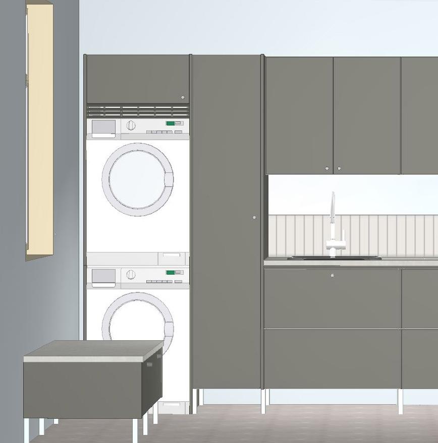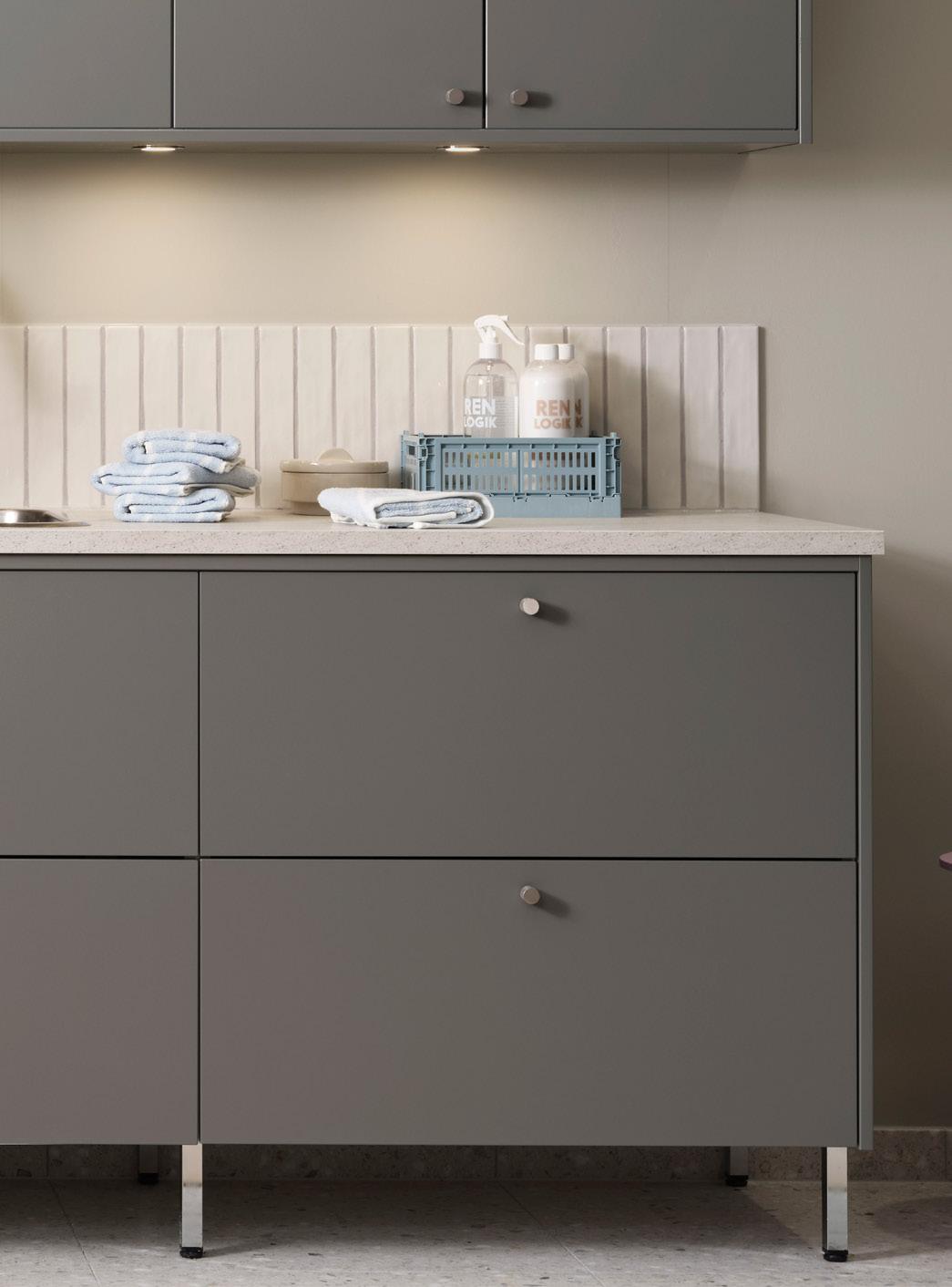 Et lyst og innbydende vaskerom med døren Maja i betonggrå. Moderne og stilrent i både funksjon og uttrykk med vår nye benkeplate i laminat, fliser som sprutbeskyttelse, rikelig med oppbevaring og praktisk benk/avlastningsflate. Her ønsker alle å hjelpe til med klesvasken!