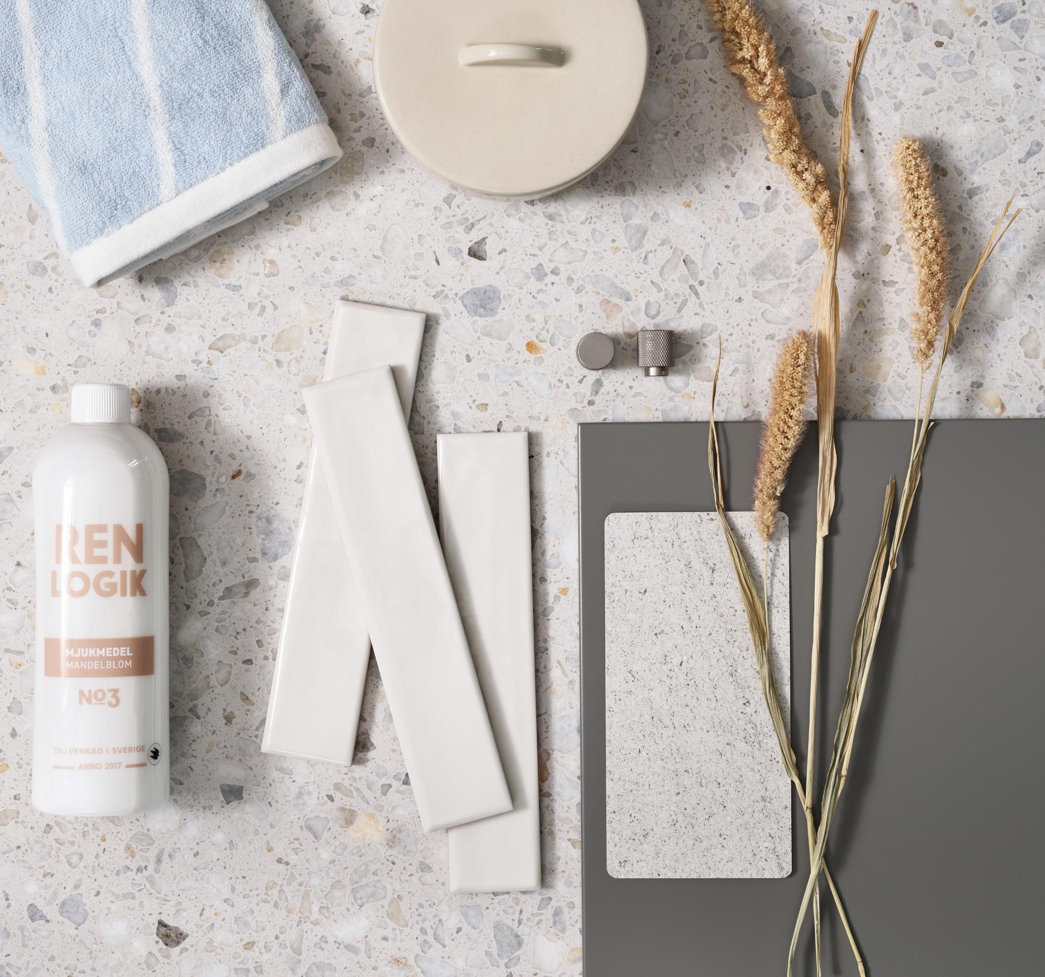 De nye melamindørene Ilse beige og Ilse brun eik med Svanemerket gjør vaskerommet til en fredelig oase. En garderobevegg, hevede hvitevarer og gode arbeidsflater på benkeplaten gjør hverdagen enklere. Hyller med plass til småting og lett tilgjengelige vaskeromskurver i det åpne hjørnet forsterker følelsen av bekvemmelighet. Et vakkert terrazzogulv og sprutvegg binder hele looken sammen.