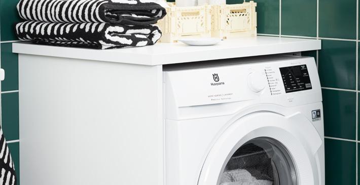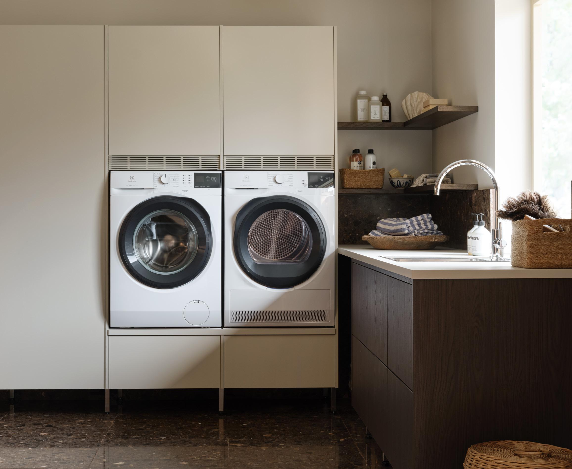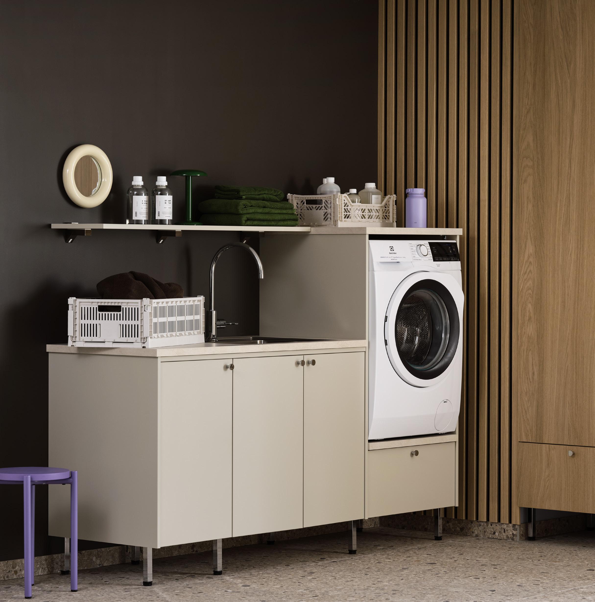Et vaskerom i naturlige toner, en varm trefølelse og en materialmiks som skaper dynamikk. Vaskerommet har mange smarte løsninger som gjør hverdagen enklere, for eksempel den praktiske plasseringen av vaskemaskinen, som gir en ergonomisk arbeidsstilling, oppbevaringsområde på toppen av maskinen og oppbevaringsveggen i tre, som gir rikelig med plass til sakene dine.