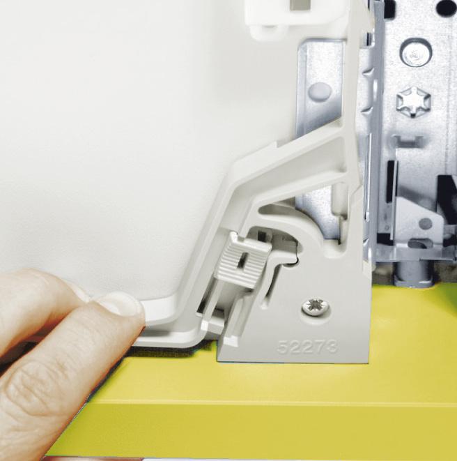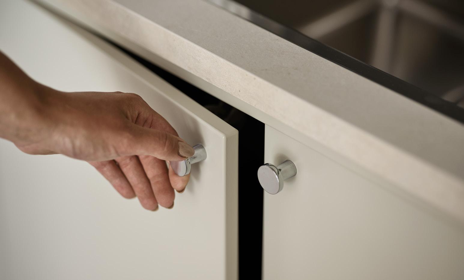 Dørene våre er utstyrt med hengsler med innebygd demping. Hengslene har en åpningsvinkel på 120°, er selvlukkende og helt i metall med klipsfatning. Pantryskap med innvendige skuffer med fullt uttrekk har hengsler med en åpningsvinkel på 155°.