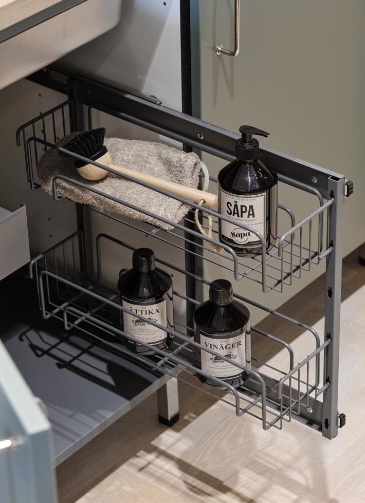 Oppvaskbenkskapene har bunnbeskyttelse av plast. Tilgjengelig til dører eller skuffer i breddene 600 og 800 mm. Kildesortering Sarek er tilgjengelig som tilbehør til oppvaskbenkeskap med dører. Til oppvaskbenkeskap med skuff med fullt uttrekk Scala i breddene 600 og 800 mm er det lagt til en ramme for kildesortering Ängsö med plass til fire eller seks bøtter (kjøpes separat). Skapene skal monteres plant, slik at eventuelle lekkasjer blir synlige i skapet før de fører til alvorlige skader på gulv eller bjelkelag.