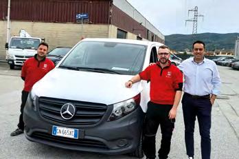 Alessandro Ciucci (al centro), titolare della TCA, e Fabrizio Menichicchi (a destra) di Rossi Veicoli posano insieme ad un collaboratore di Alessandro di fronte al Mercedes-Benz eVito, oggetto dell’ultimo acquisto del corriere.