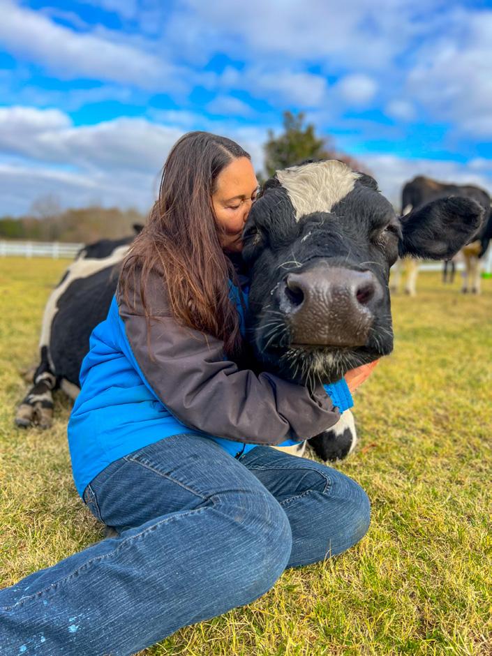 I created Cow Hug Therapy 25 years ago when I rescued my very first cow named Buddha. I would lean against her at the end of exhausting days and she, in turn, would wrap her neck around me and hold me for hours while I cried onto her shoulder. She healed me and kept me strong, and I knew that the rest of the world needed this type of healing, as well.