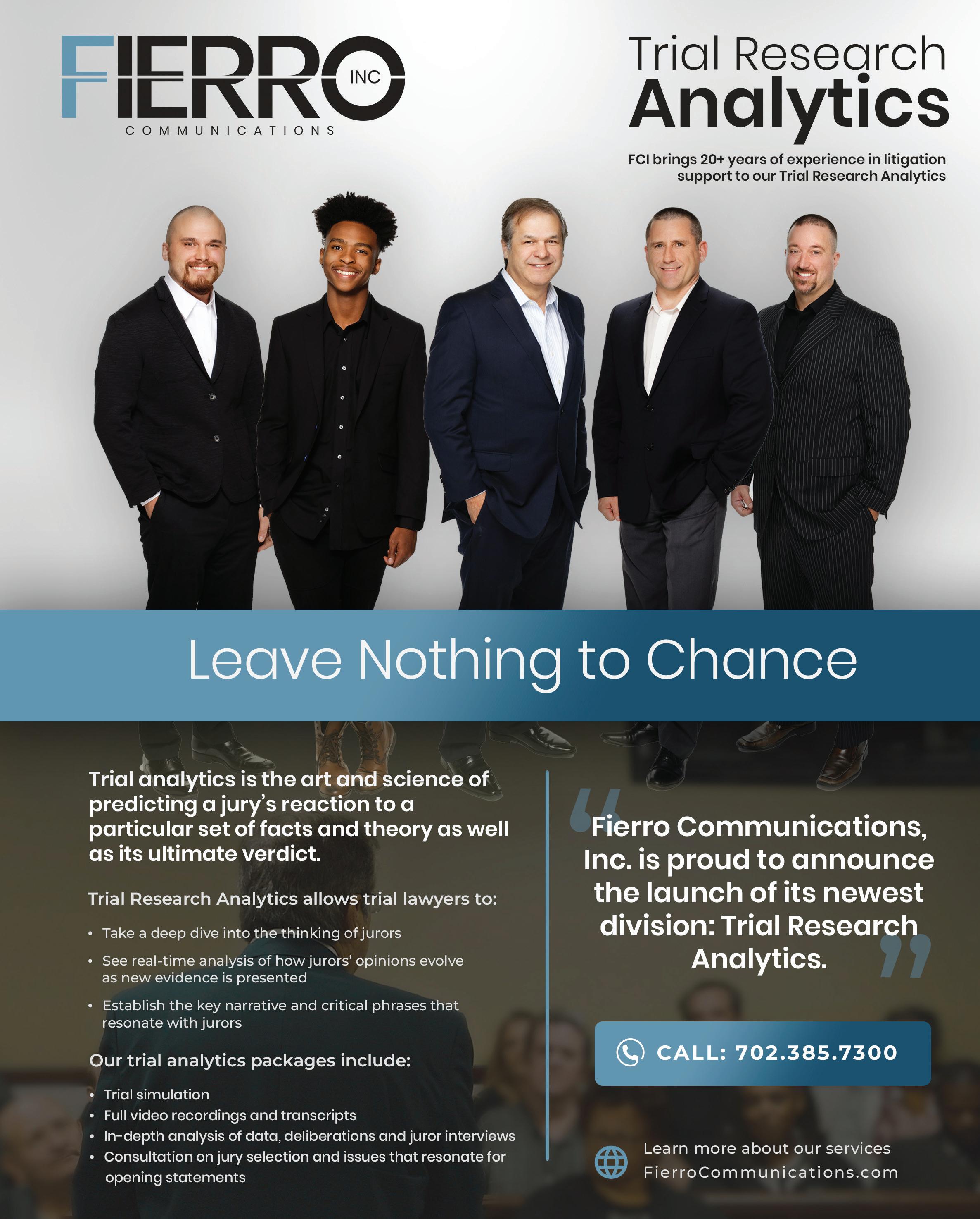 He is president of Fierro Communications, Inc., which conducts mock juries and focus groups in addition to public relations and marketing. Fierro is the author of several books including “Road Rage: The Senseless Murder of Tammy Meyers.” He has made numerous appearances on national TV news programs.