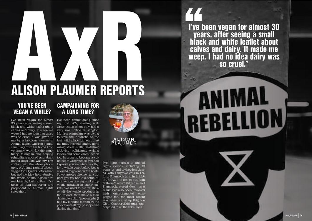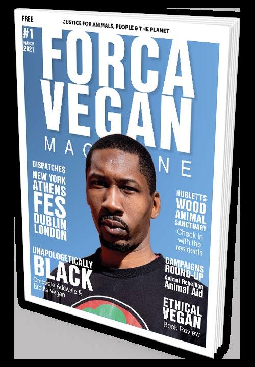 Welcome to Issue One (March 2021) of Forca Vegan – the free online vegan magazine that joins up activists and campaigns across the globe into a glorious celebration of all things vegan. Born into a world emerging from Lockdown and the global COVID Crisis, Forca Vegan brings together a feelgood factor, information, education and a myriad of different voices and experiences from a multitude of global vegan activists. Removing barriers and focusing on solutions, Forca Vegan reflects a living, growing, unfolding history of liberation, understanding and evolution at a time like never before, and at a time like we never needed before. If we are to face the problems that lie in front of us and lie ahead, and change them for the better, we’ll all benefit from listening to a broader vegan fanbase and learning from these experiences, and turning these lessons into ef- fective and consistent education & action.
