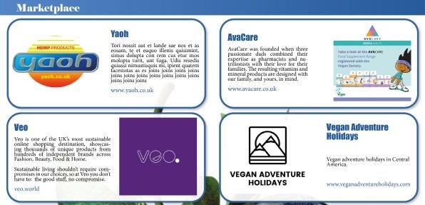 Marketplace: A vibrant collection of vegan businesses, services and initiatives with some dynamic and inspira- tional individuals behind them. Please do give them a visit and say hello!