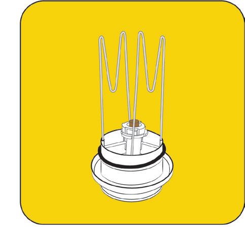 6. Aseta suodatinkehikon langat (2 kpl) venttiilin takapuolella oleviin reikiin rinnakkain. Tarvittaessa lankoja voi lyhentää. Mitoita suodatinlangat siten ettei suodatin ole kiinni ulkoritilässä. Asenna suodatin suodatinohjeen mukaisesti (kts. ohje kääntöpuolella). Huom. suodatin voidaan tarvittaessa asentaa myös ilman kehikkolankoja! Tarkista, että tiivisterengas on suodatinohjeen osoittamassa kohdassa.