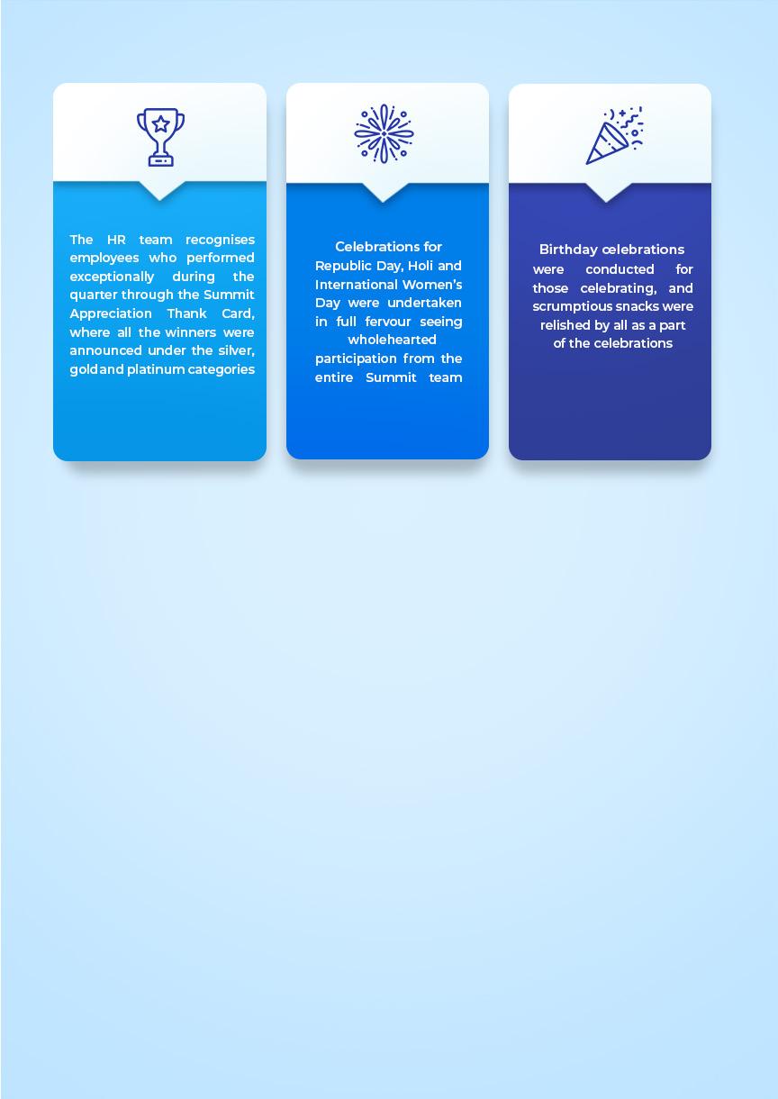 As of now, we have already put in place a few solid practices that strengthen our cultural stand. A few of these are our Prevention of Sexual Harassment (POSH) sessions, constant re-skilling and upskilling programs, and recognition of exceptional performers under our Summit Appreciation Thank Card processes.