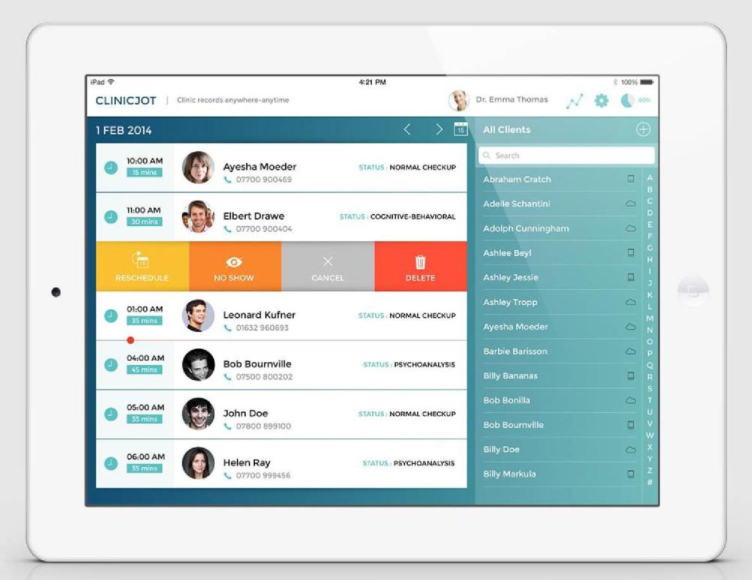 This is an iPad application which is all-in-one management tool with the ability to type or write notes, draw or write on photos or a pre-templates images for Practitioners. It can be termed as a complete solution for a consultant to manage their entire practice. The application will enable in creating and maintaining client records, medical records, manage appointments, generate reports. and customise Consent to Treatment form. The application will support single therapist as well as multi-therapist clinic setups. This application will allow the therapist(s) to maintain records of each client and view them at anytime before or during the next appointment.