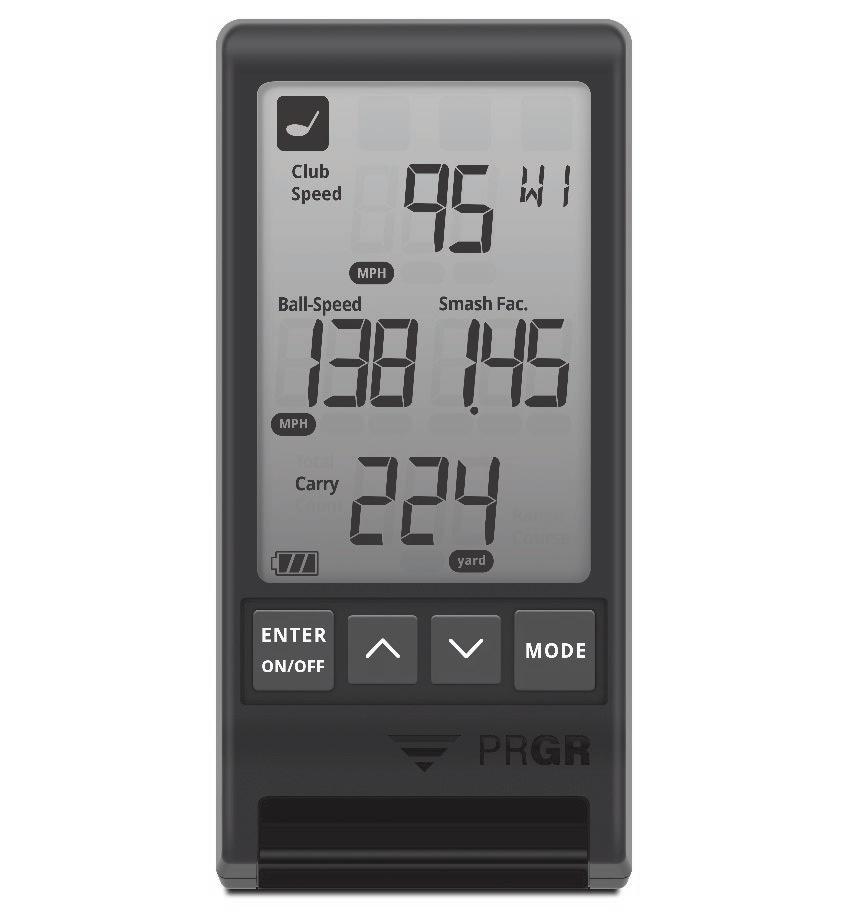 The PRGR measures Club Speed, Ball Speed, Smash Factor, Carry Distance, and Total Distance when hitting a golf ball. It will also measure Club Speed when you are not hitting a ball.