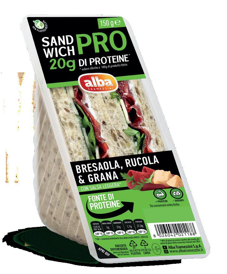 SANDWICH PRO Bresaola, Rucola e Grana padano La bresaola è ricca di amminoacidi essenziali e Sali minerali come il ferro, che la rendono adatta alle diete ipocaloriche e degli sportivi. Il grana padano DOP è ricco di proteine ad alto valore biologico, sali minerali e vitamine come la B12.