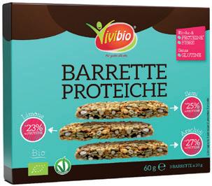 ViviBio presenta, inoltre, le nuove Barrette proteiche in un multipack contenente 3 gusti differenti: limone, semi misti e arachidi salate Ogni barretta contiene almeno il 23% di proteine vegetali e una grande quantità di fibre. Inoltre, sono prive di glutine e lattosio e certificate VeganOK. Si configurano come uno snack pratico e conciliano gusti e ricette uniche con un elevato apporto proteico.