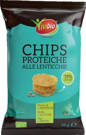 Le Chips proteiche alle lenticchie, a ridotto contenuto di grassi (solo il 5%), hanno anch’esse un ottimo apporto proteico e sono adatte proprio a tutti, in quanto senza glutine e certificate VeganOK. Formato: 35g