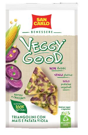 Novità in casa San Carlo: Veggy Good, lo snack naturalmente irresistibile, amplia la sua gamma di prodotti con i nuovi Triangolini Mais e Patata Viola Uno snack croccante e sfizioso in grado di coniugare gusto e benessere e soddisfare anche i palati più esigenti, grazie ad un connubio di sapori unico e travolgente: quello del mais, rustico e leggermente affumicato, e della patata viola, dolce e deciso allo stesso tempo.