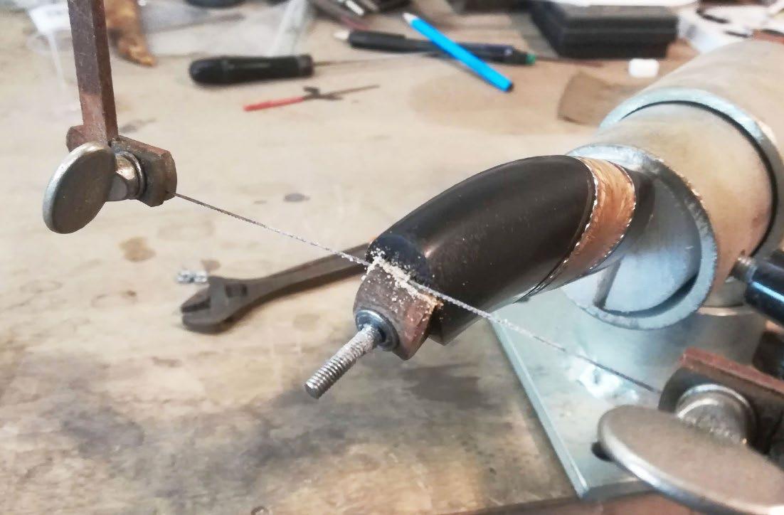 DEN INDVENDIGE KURVE LAVER DU MED EN Ø75 MM GUMMISLIBER. DU MONTERER DEN I SØJLEBOREMASKINEN MED ET LAND DER ER 100% VINKELRET PÅ SLIBEREN. DET ER MEGET VIGTIGT AT VINKLERNE PASSER –ELLERS ER DET NÆSTEN UMULIGT AT TILPASSE DE FORSKELLIGE DELE.