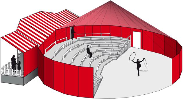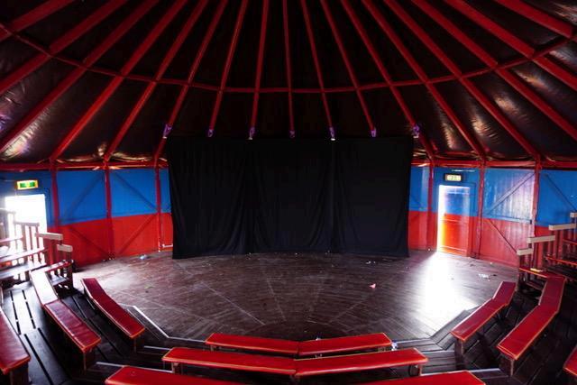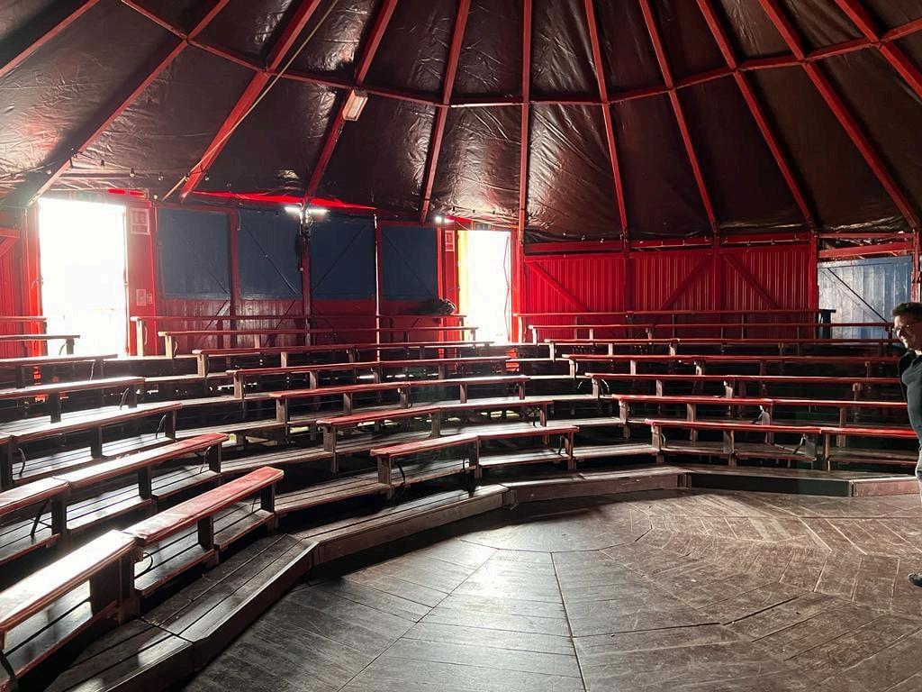 > This is a round structure with a diameter of almost 13 meters under a steep canvas roof rising to around 7 meters It is a darkened space in brown and red with a wooden stage floor. There is raked bench seating for 185 people in a half moon shape.
