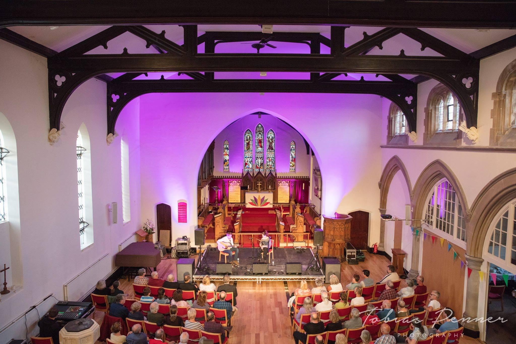 > St Catherine’s Church has a small raised stage built with litedeck The audience are all seated on one level