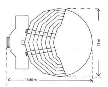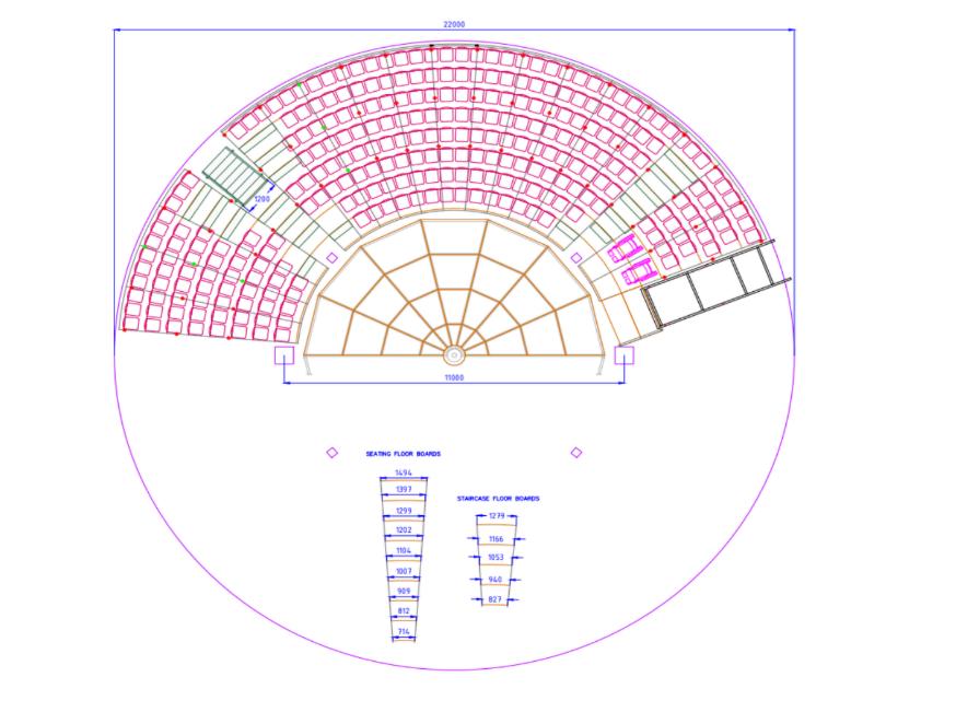 > This is a square structure with a diameter of 75 meters, seating approx 50 around a small raised stage