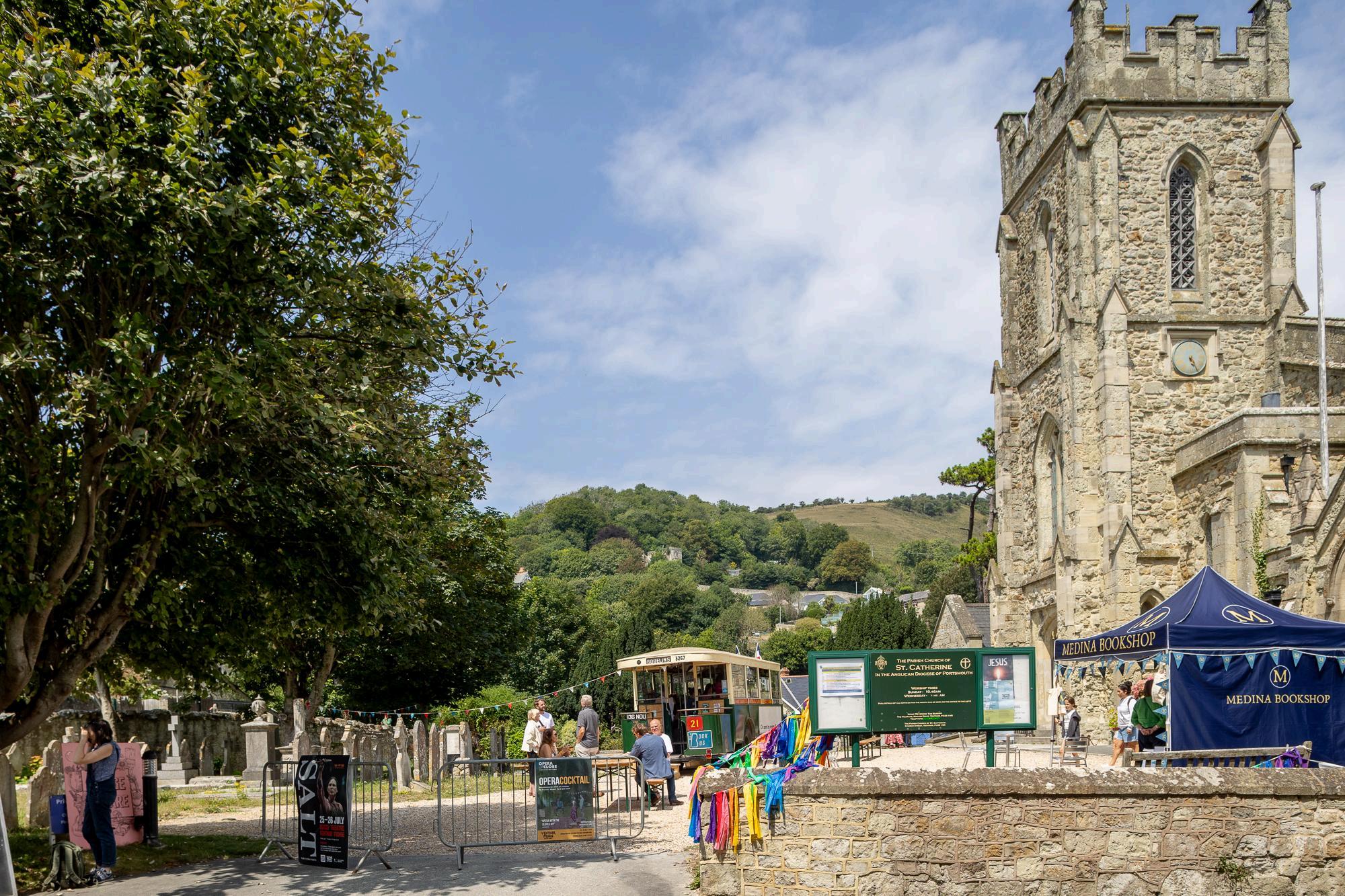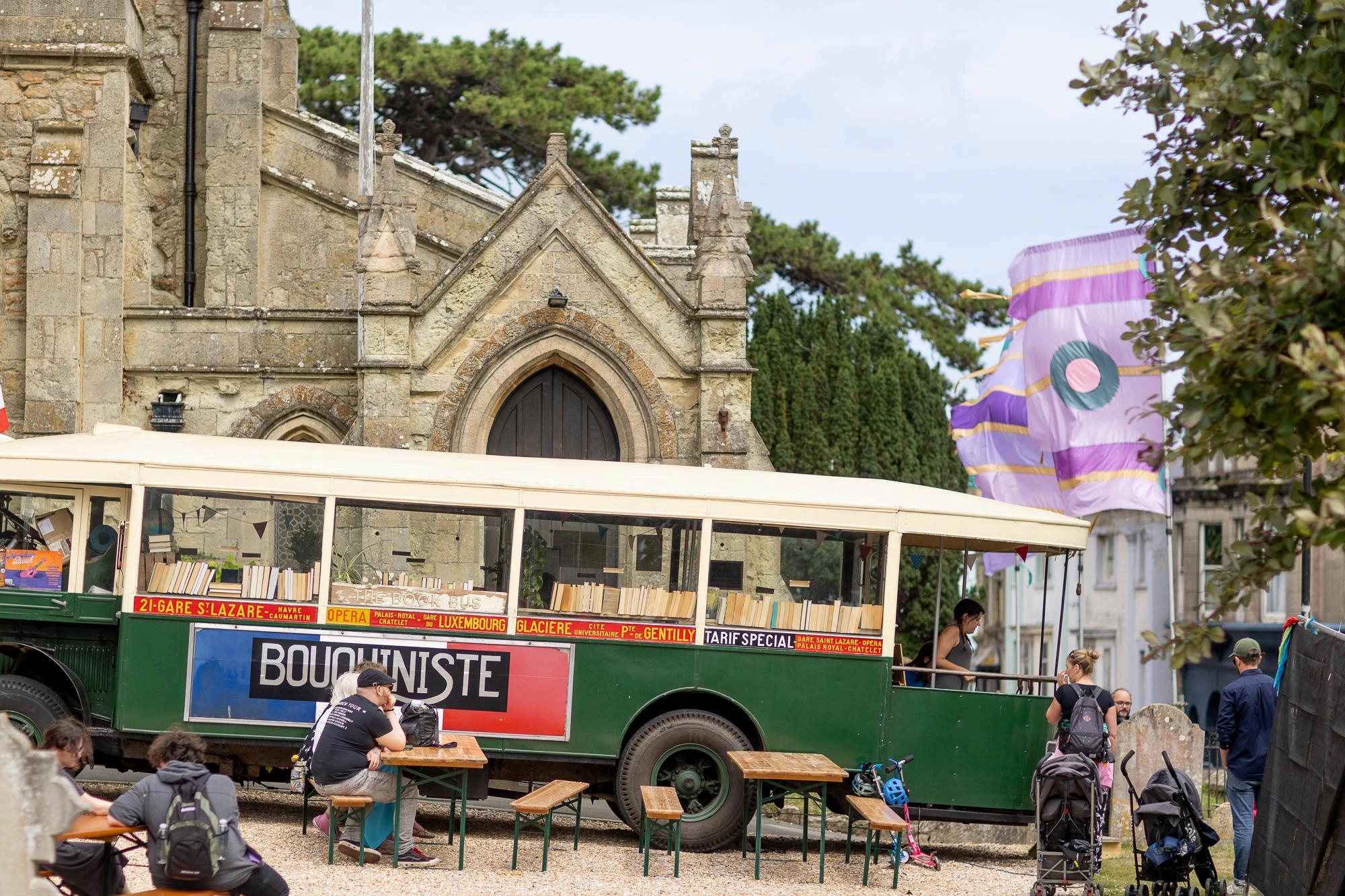 The gravel area in front of St Catherine’s Church and the small garden in the graveyard are spaces open to proposals and ideas A beautiful 1930’s Parisian bus is located here for part of the festival and operates as a pop up book shop, as well as sometimes able to host small performances