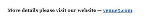 The banqueting hall at Venue 5 boasts a stunning designer interior that creates an inviting and sophisticated atmosphere for events of all kinds. Its modern vibe, combined with thoughtful lighting and layout, ensures every gathering feels special and photogenic, from intimate family milestones to large-scale celebrations.