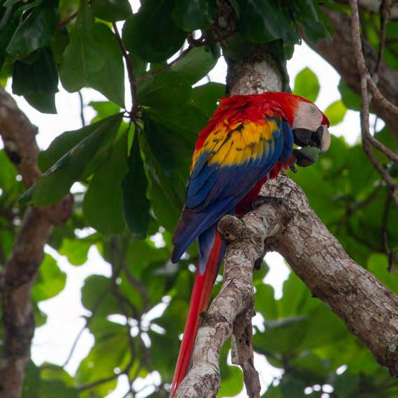 Ara Ambigua, también conocida como guacamaya verde, es posible verla volar los cielos de la zona de Tortuguero en el Caribe Norte del país, también los Parques Nacionales Carara, Bahía Ballena, Corcovado y Peñas Blancas en el Pacífico sur. Esta ave tiene una belleza peculiar y sus colores rojos y verdes son espectaculares, además siempre se ven en pares ya que son aves fieles a su pareja por toda la vida.