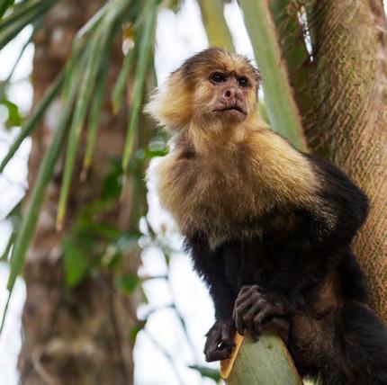 Mono Cariblanco o mono capuchino, que tiene ese nombre por su caracterís tica coronilla negra. Es muy común verlo cerca de los humanos y no les temen, así que no descuides tus objetos personales cuando los veas rondando por donde estés. Es posible verlos en diferentes zonas como en los Parques Nacionales Rincón de la Vieja, Corcovado, Manuel Antonio y en el área de Guanacaste Norte.