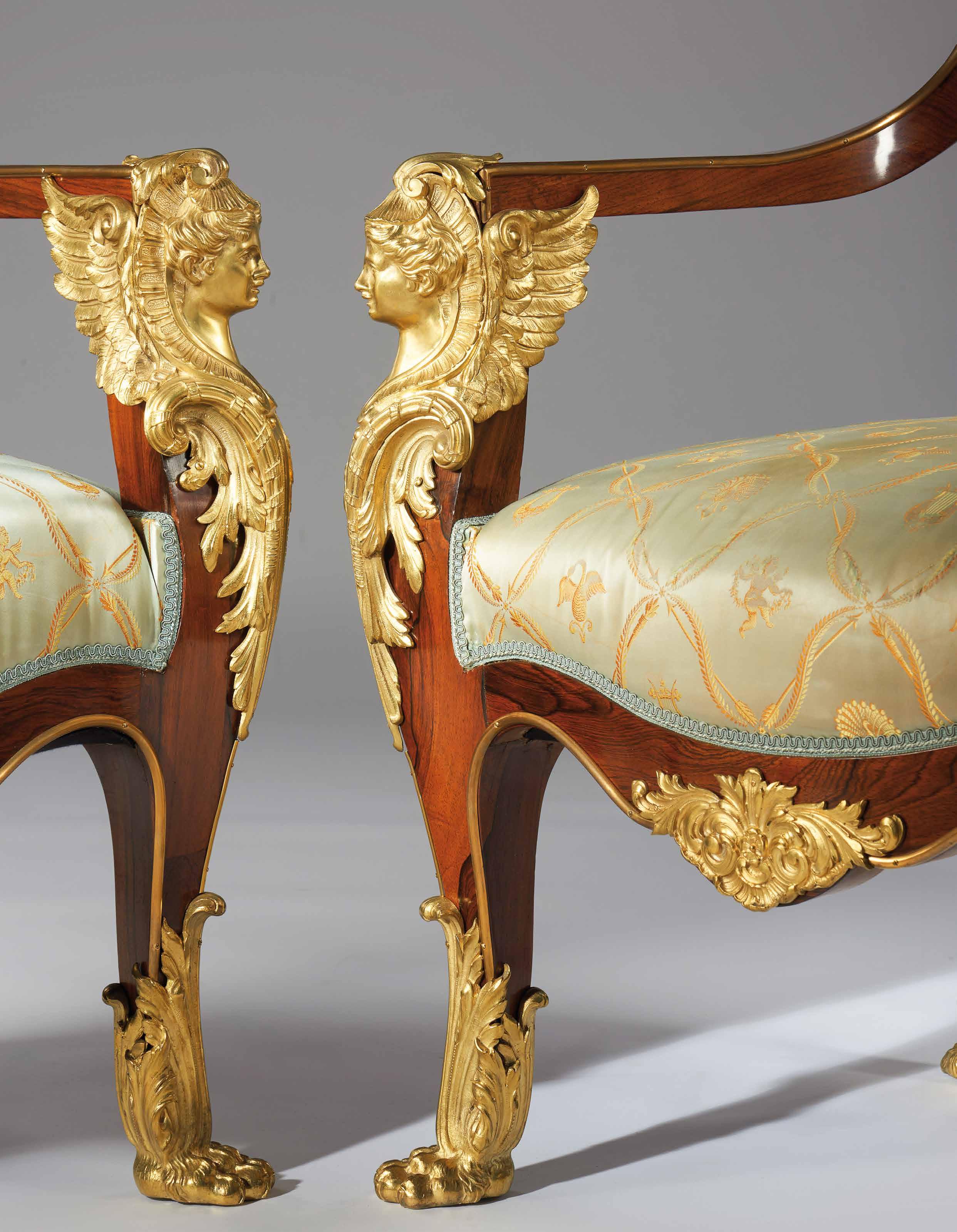 Com montures em bronze dourado, relevado e cinzelado representando esfinge, enrolamentos vegetalistas e pernas posteriores e dianteiras terminando em patas de leão