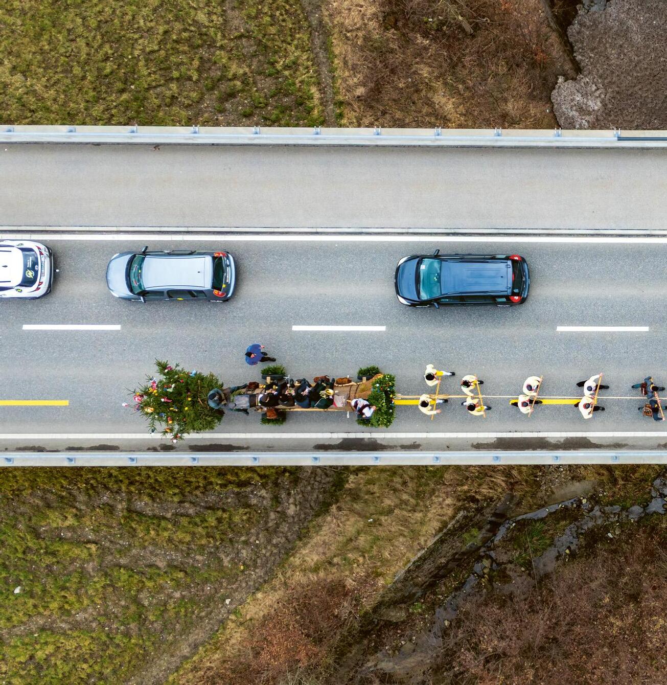 Arbeit bei leichtem Schneefall lagen das Bloch und der Reststamm am Wegrand bereit zum Verladen. Etwa drei Wochen vor dem Fasnachtsmontag trifft sich die Blochmannschaft zur ersten Versammlung, an der bei Bedarf neue Mitglieder aufgenommen oder solche, die sich nicht statutarisch verhalten haben, durch Mehrheitsbeschluss ausgeschlossen werden, denn «sauberes Auftreten und anständiges Verhalten ist erste Pflicht eines jeden Mitglieds».8 Hauptpunkt dieser Zusammenkunft ist jedoch die Zuteilung der einzelnen Funktionen, welche die Mitglieder beim Umzug innehaben. Als Grundlage dafür dient die Einteilungsliste des vorangegangenen Blochumzugs. Bei alphabetischer Nennung der Teilnehmenden können diese äussern, ob sie die letztmalige Funktion behalten oder eine andere wollen. Wer eine neue Charge wahrnehmen möchte, darf aus den freigewordenen eine nennen. Als Erster darf wählen, wer die meisten Blochjahre nachweisen kann.