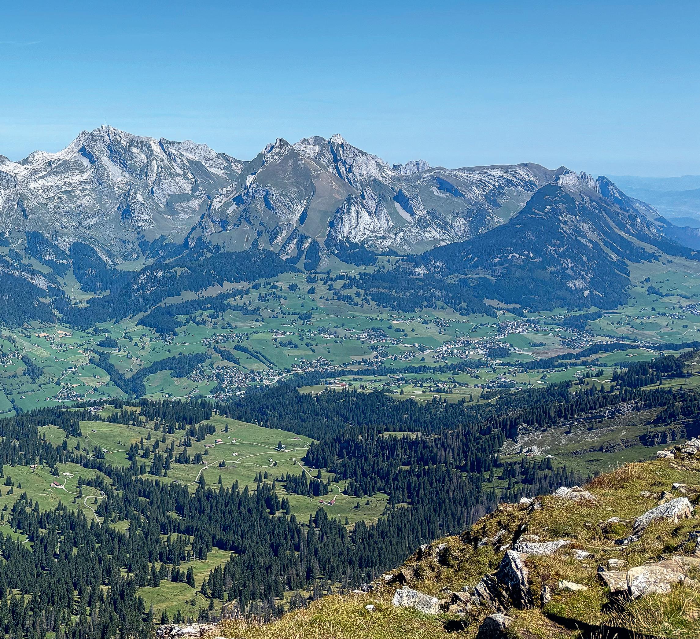 6 Blick in den östlichen Alpstein, mit (von links) Alp Sigel, Bogartenfirst, Marwees, Ebenalp, Schäfler, Altenalptürm, Säntis, Öhrli und Girenspitz.