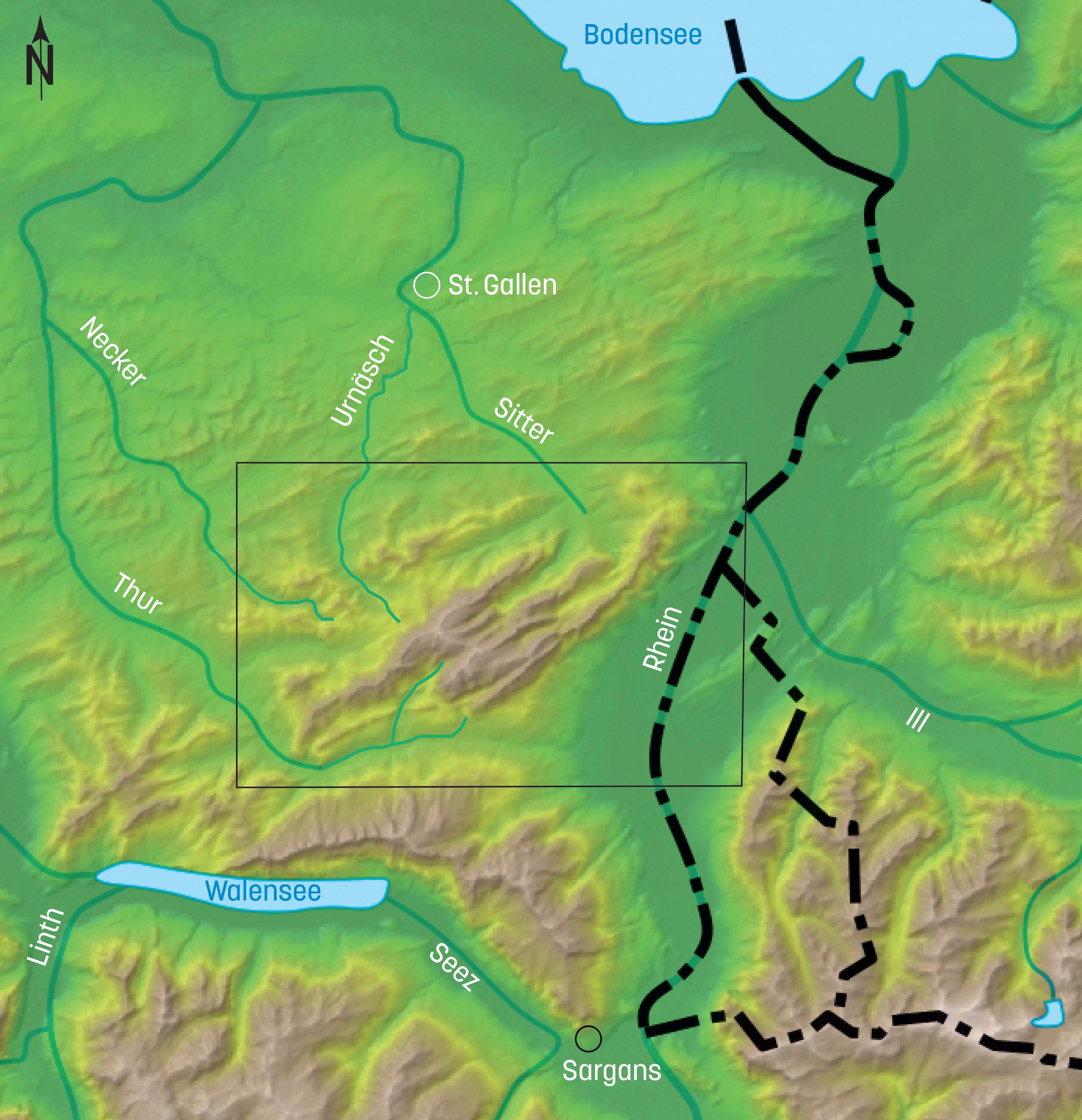 licher Richtung von der Talung der Thur und gegen Osten vom St. Galler Rheintal. Im Zentrum dieses Gebiets befinden sich die drei nahezu parallel von Südwesten nach Nordosten verlaufenden Bergzüge des Alpsteins.