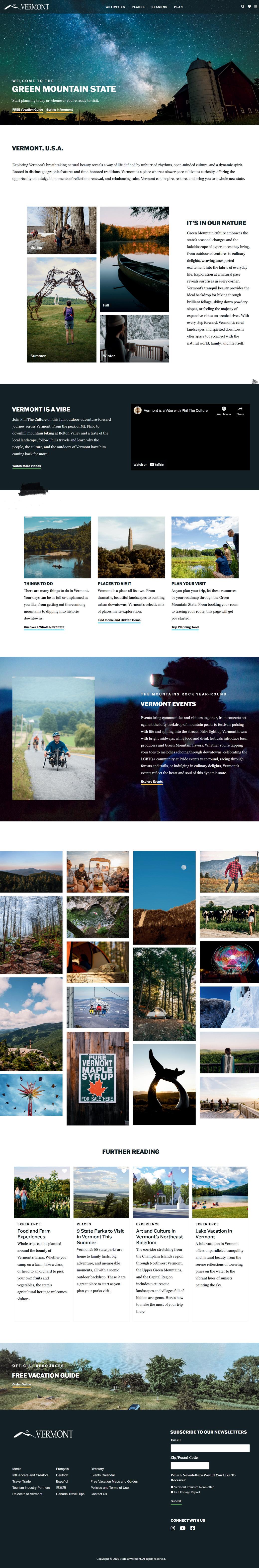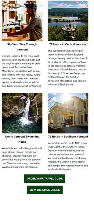 The Vermont Tourism Marketing Program communicates your message via dynamic print and digital products, promoting your business to the 80 million people within a day’s drive of Vermont. Created in partnership between the Vermont Chamber of Commerce and the Vermont Department of Tourism and Marketing, The Vermont Inspiration Guide and VermontVacation.com Stay & Play Directory are the official fulfillment pieces for the state of Vermont.