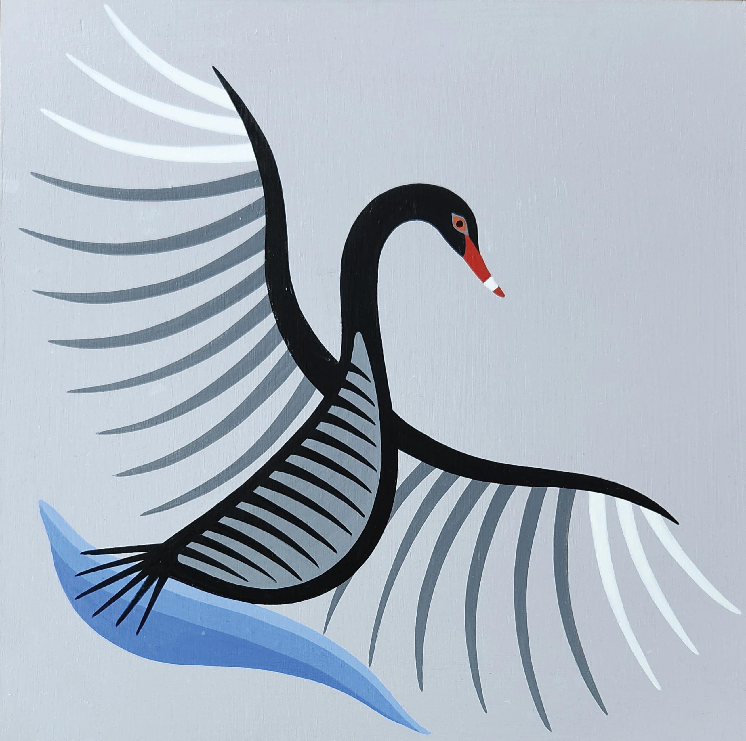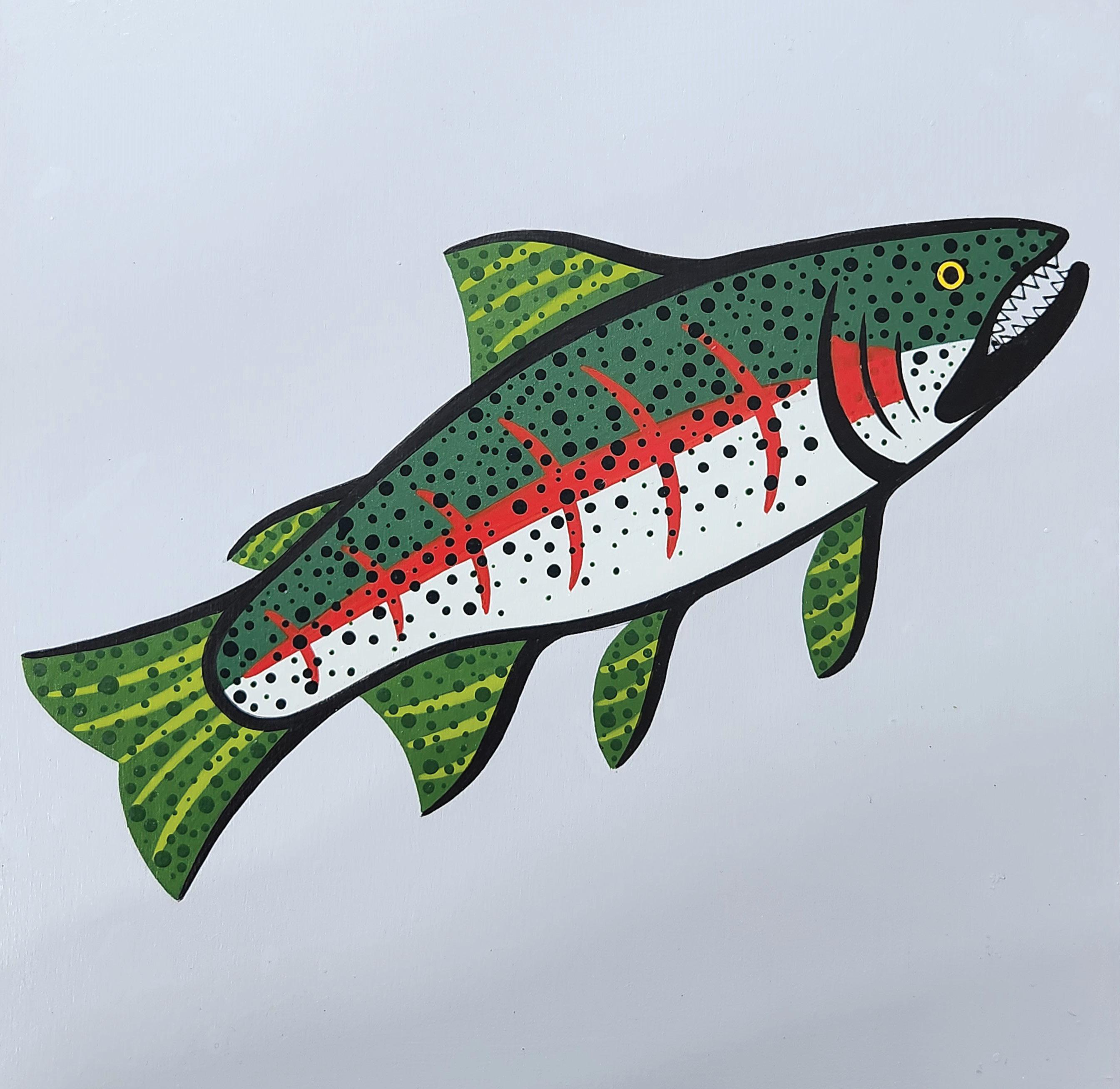 After the exploration of West Coast and Plains First Nations’ art forms, Wilson started to draw inspiration from his connection to the Syilx Okanagan Nation art. He continued to study Syilx pictographs, first in historic publications in the local museum, later in various First Nations art books and on-line. Most of his subject matter is focused on water as a sacred element which nourishes life, brings the salmon to rivers and lakes, and indicates travel and trading.