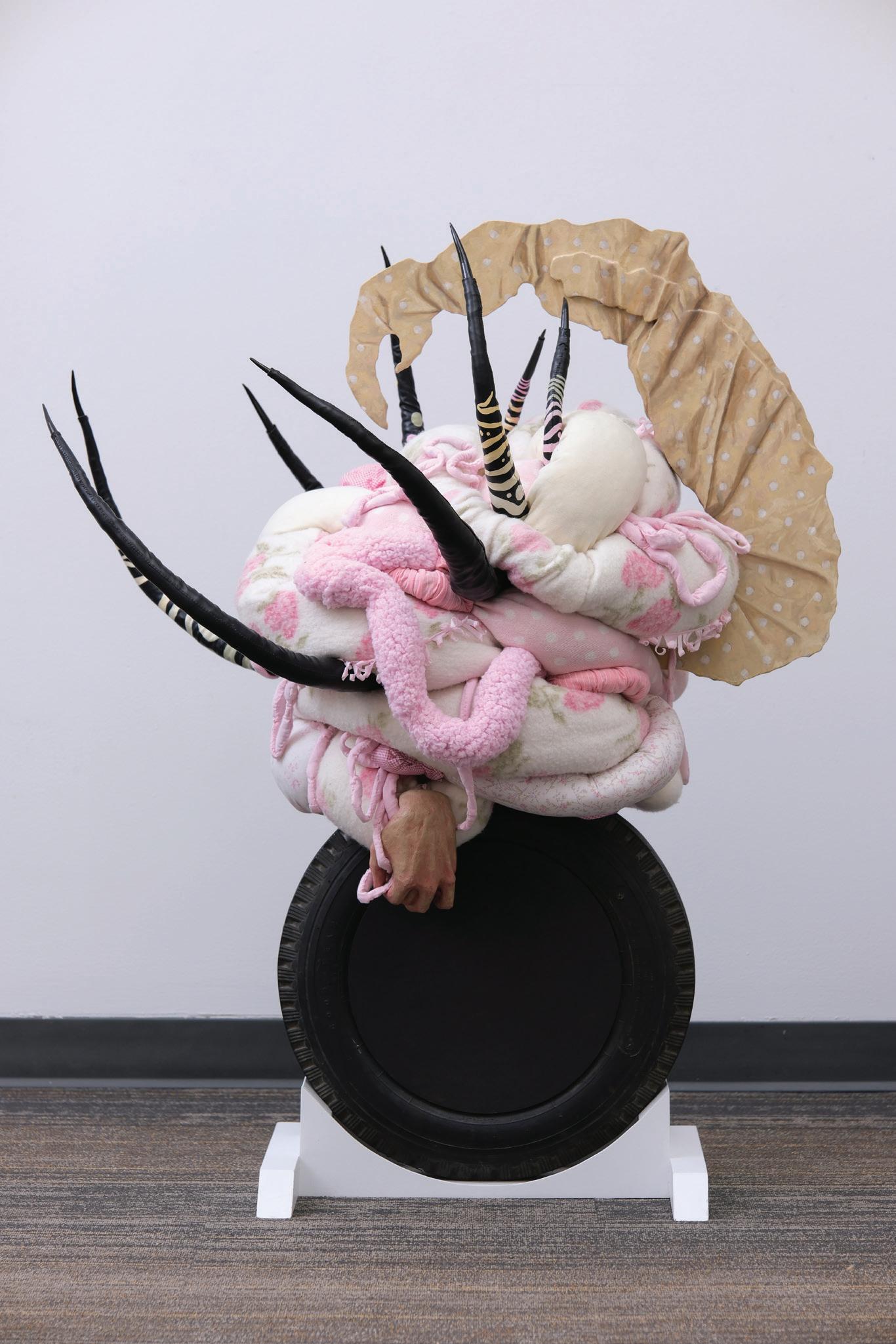 Polka Dot Tail, 2024. Reclaimed fabrics, tire, ceramics, wire, and wood with oil paint. 45x40x33 in.