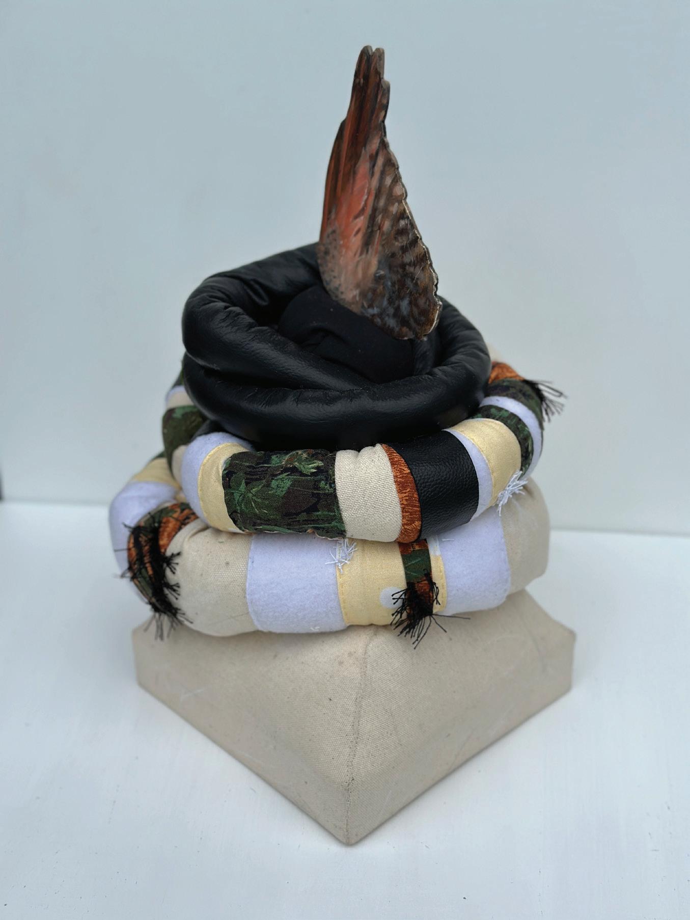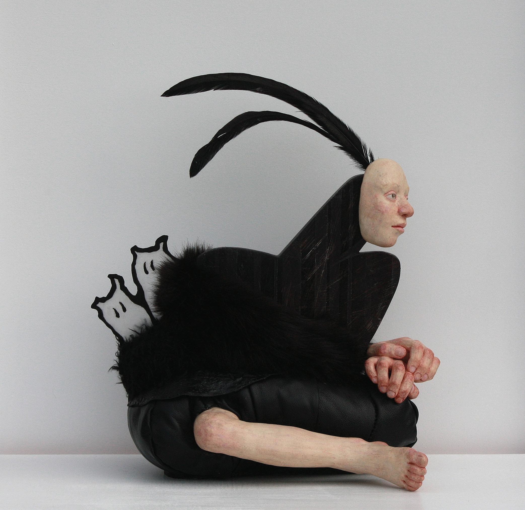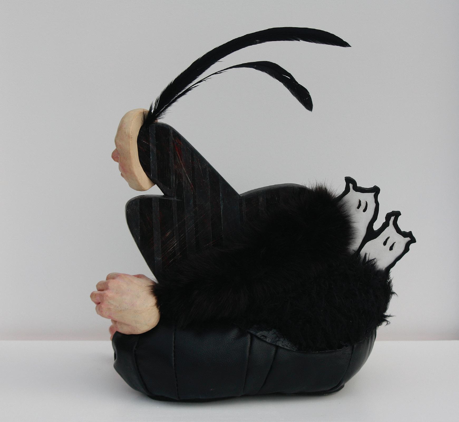Black with Ghosts, 2024. Ceramics with reclaimed leather, fabric, plexiglass, wood, feathers, with oil paint.