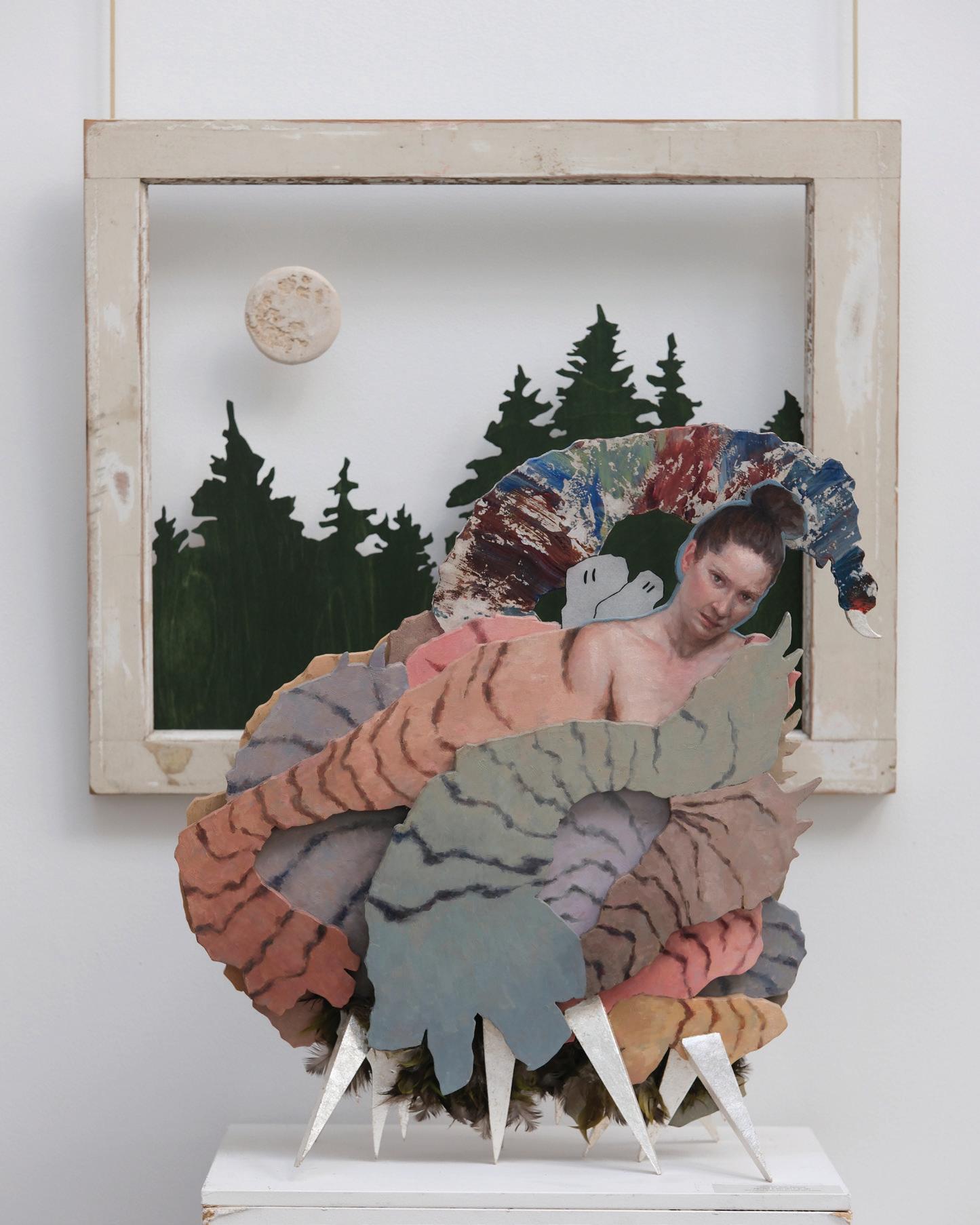 Portals to Elsewhere by Amy J. Dyck invites viewers on an immersive journey through sculptures, paintings, collages, and a circular installation. These works explore the complex realities and challenges associated with living with a chronic illness and are deeply autobiographical. Dyck’s works draw audiences into her world and speak to themes and emotions which are universal: feelings of fragmentation, dislocation, and grief; memories of trauma and fear; and hopes for freedom - whether metaphorical or real - through imagined portals to an outside world. Dyck’s work embodies “difficult beauty”, a concept discussed by philosophy professor and journalist Chloé Cooper Jones in Easy Beauty: A Memoir, which chronicles her experiences with living with a disability. Cooper Jones summarizes British philosopher Bernard Bosanquet’s theorization of easy beauty as opposed to difficult beauty, noting that “easy beauty is apparent and unchallenging,” while difficult beauty “requires more time, patience and a higher amount of concentration.” She further notes that “the intricacy of a difficult aesthetic object can provoke resentment and disgust in us if we are unable to resolve and classify the complex elements of the object.”1